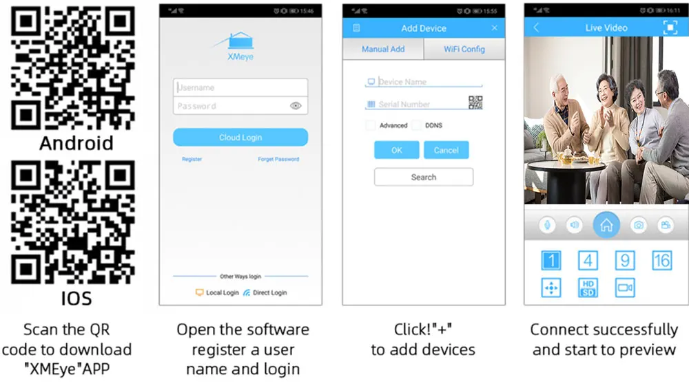 Easy setting , just 4 steps for mobile phone viewing,View live video of the system from anywhere and anytime via you smarphone,table or PC with advanced P2P technology, you are able to remote access your system in minutes or less,no portforwarding needed, remote access has never been so easy!!!