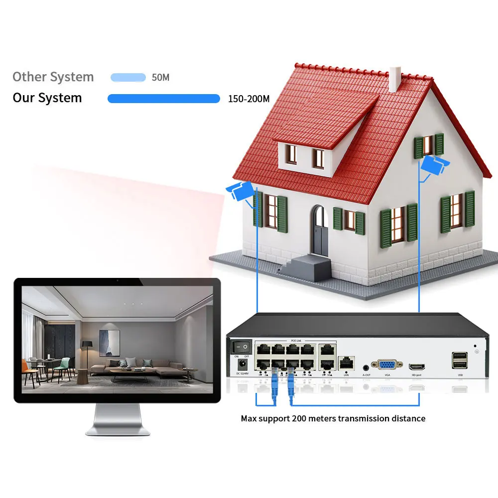 Our H.265 POE System max support150M-200MPOE cables transmission distance,which greatly increases home installation convenience.