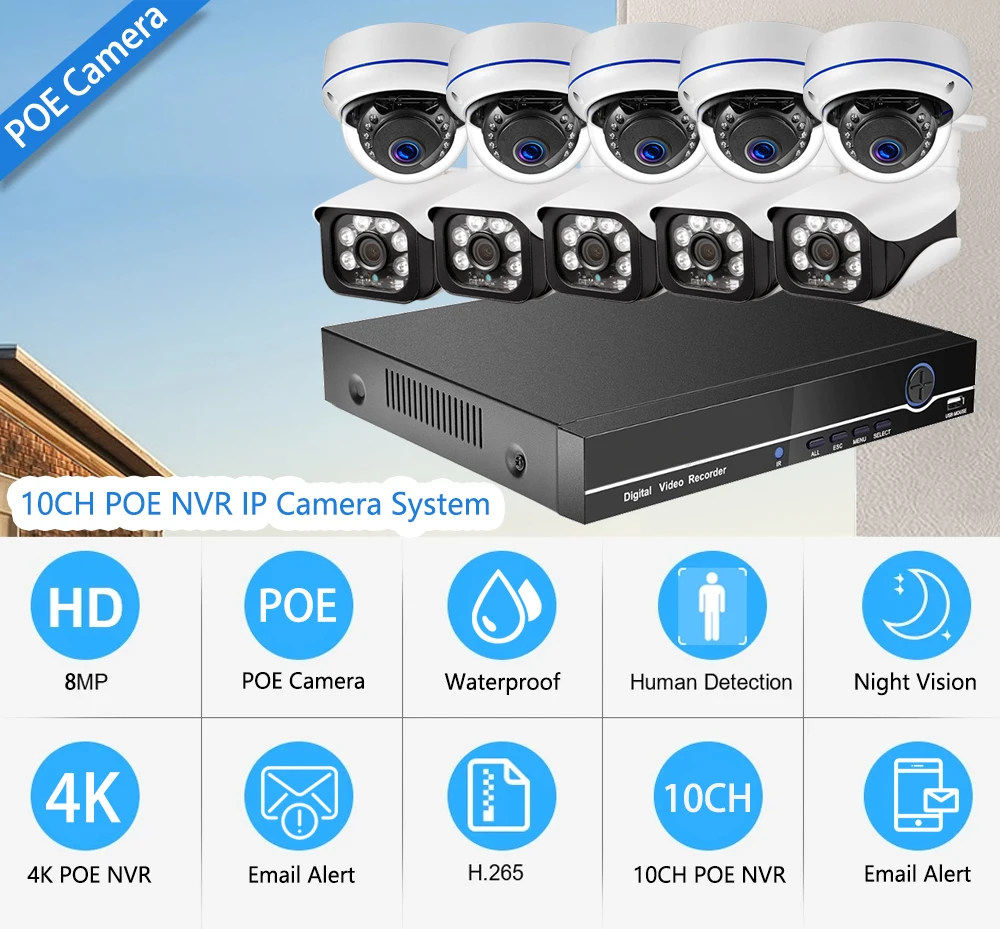 8MP 4K Security lP Camera System Audio Record Waterproof Outdoor 10CH POE NVR Human Detection CCTV Bulet Home Surveillance NVR