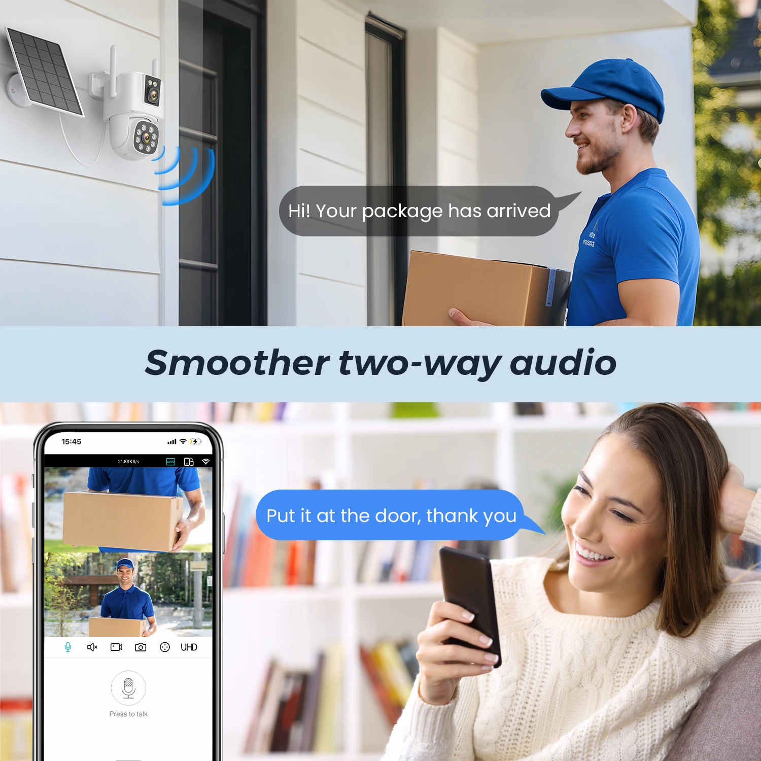 built-in microphone and speaker, loud volume; You could talk to anyone nears the camera ( Warn someone to leave your house ).