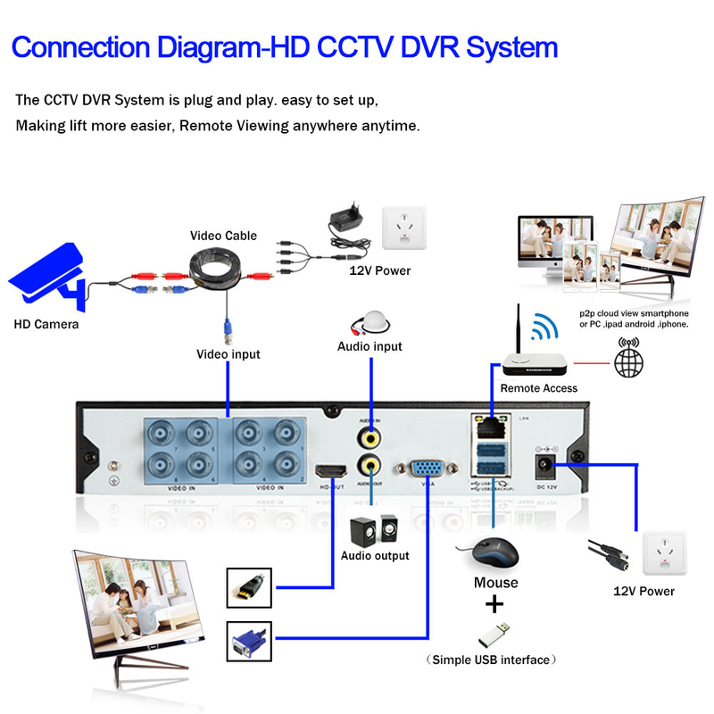 The cctv security camera is plug and play ,easy to set up,Making lift more easier.Remote viewing anywhere anytime.