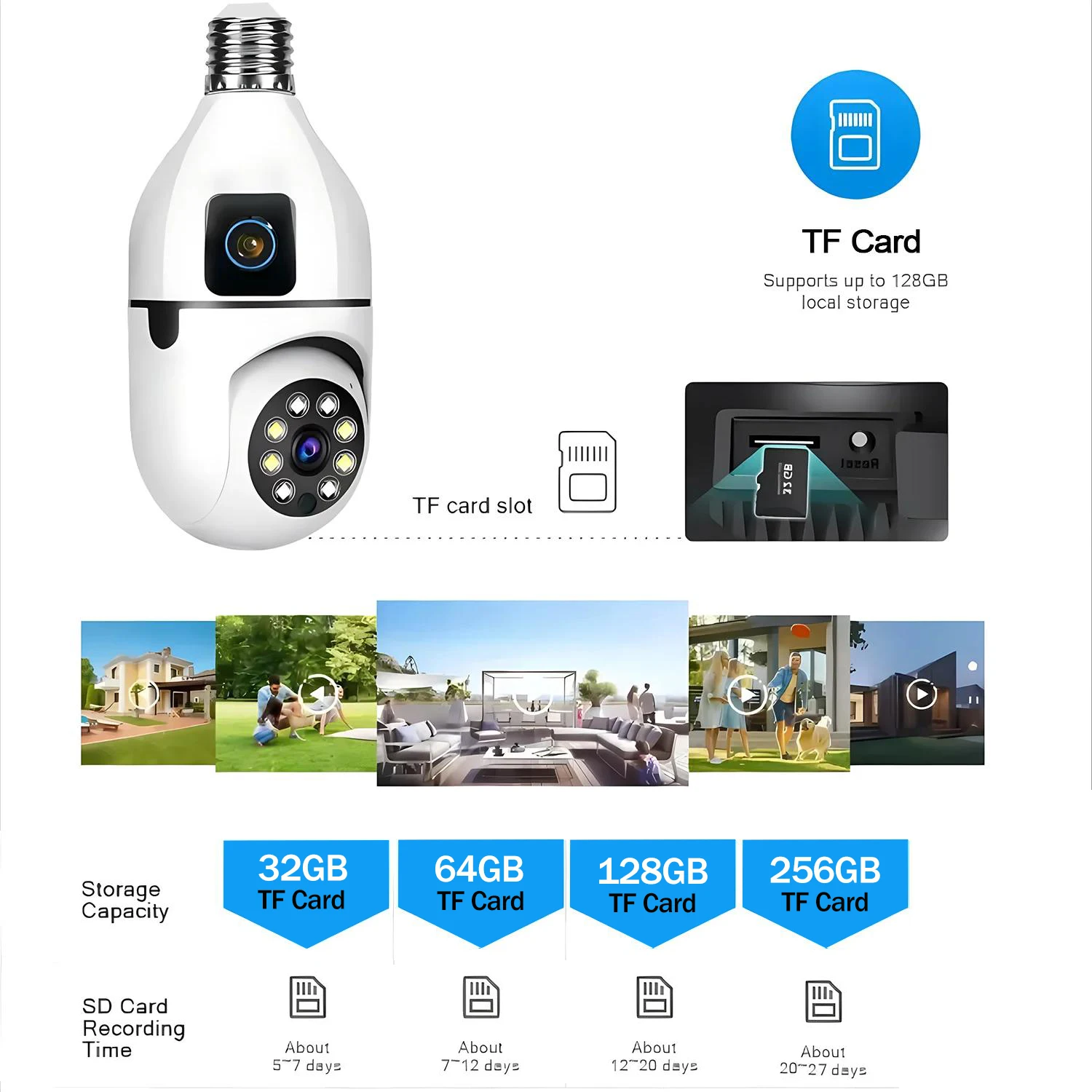 Support Max 256GB SD/TF Card and cloud storage(No-Free) monitoring data is sent to the cloud.