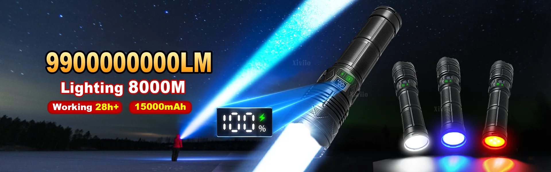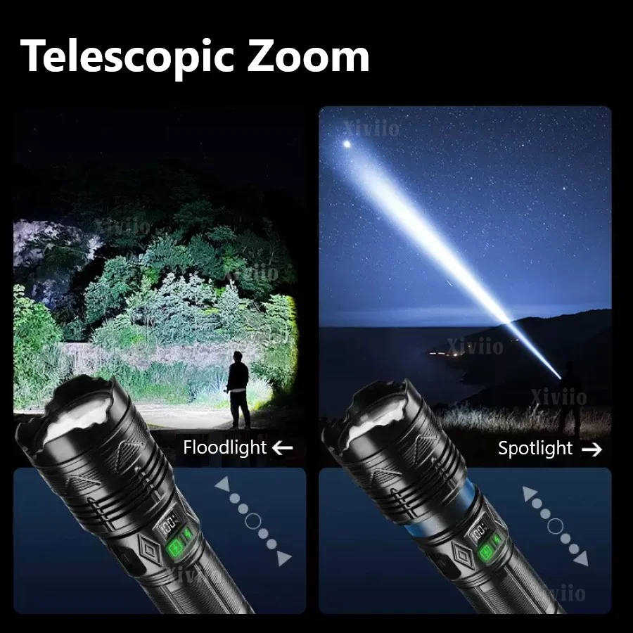 💡Equipped with the latest high-power and high-brightness 1500W wick, it can illuminate the dark night up to 8,000 meters away. It has 11 modes of main light + COB light, providing different lighting options and suitable for different scenes. Industrial thickened shell, lightweight, drop-resistant and portable. IPX6 waterproof and dustproof, fully sealed lamp body, can be used normally in bad weather such as rain and snow. Equipped with an OLED digital display to intuitively display the remaining power, it supports TYPE-C charging + power output, and can be charged outdoors for emergencies. Built-in 15000mAh large-capacity battery supports lighting for up to 22 hours. Equipped with a lanyard, it is easy to carry and meets your lighting needs for outdoor adventures, fishing, camping, home emergency, etc.