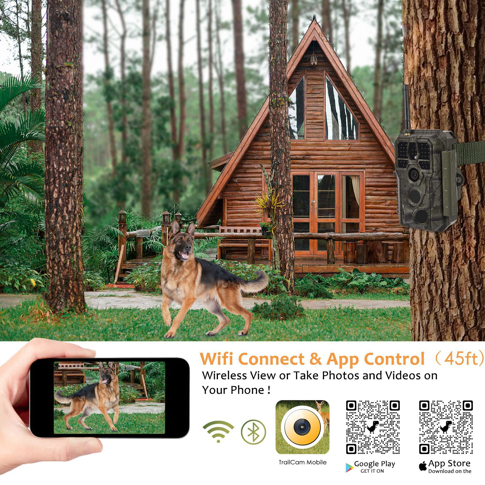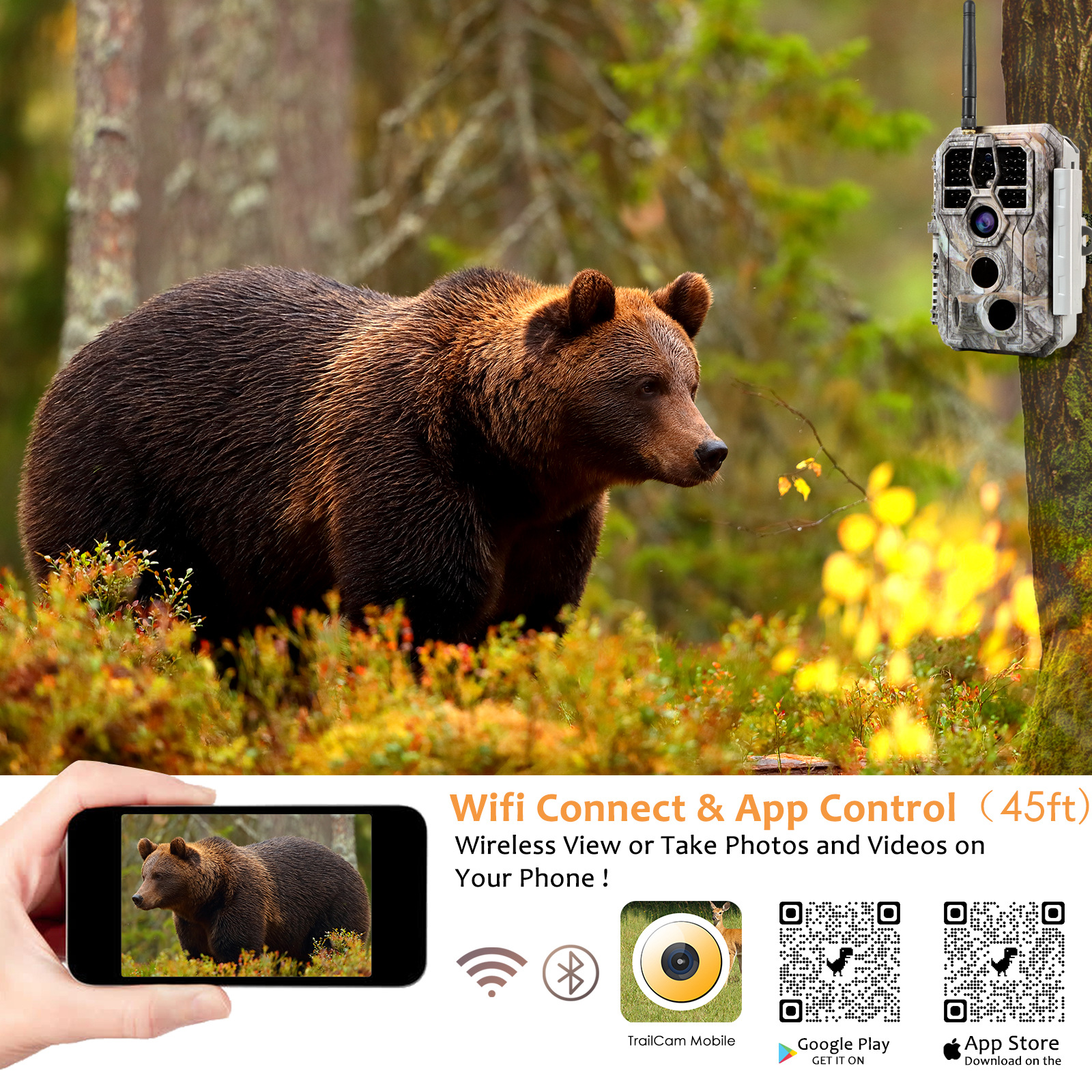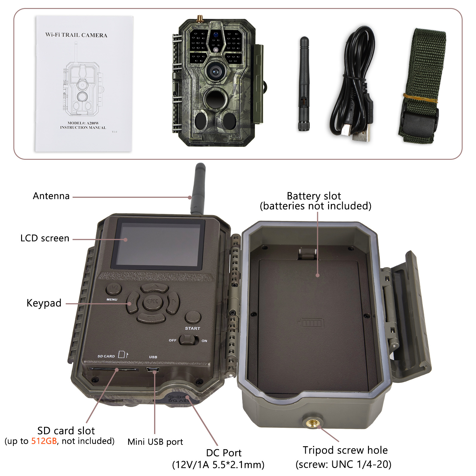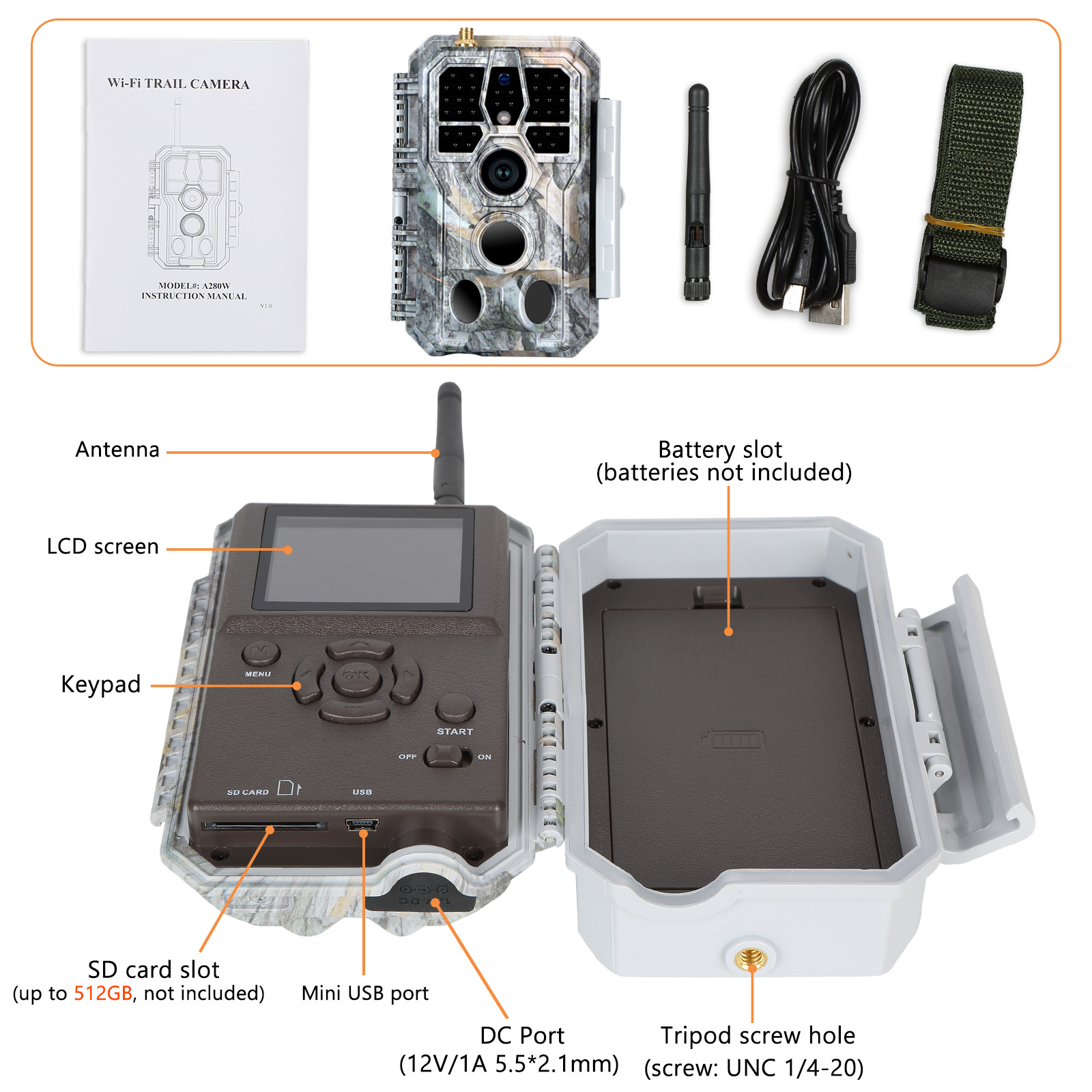A280W 64MP WIFI Wildlife Game Trail Camera Photo Traps wtih No Glow LEDs 120 Degree Wide Detection Angle, App Settings
