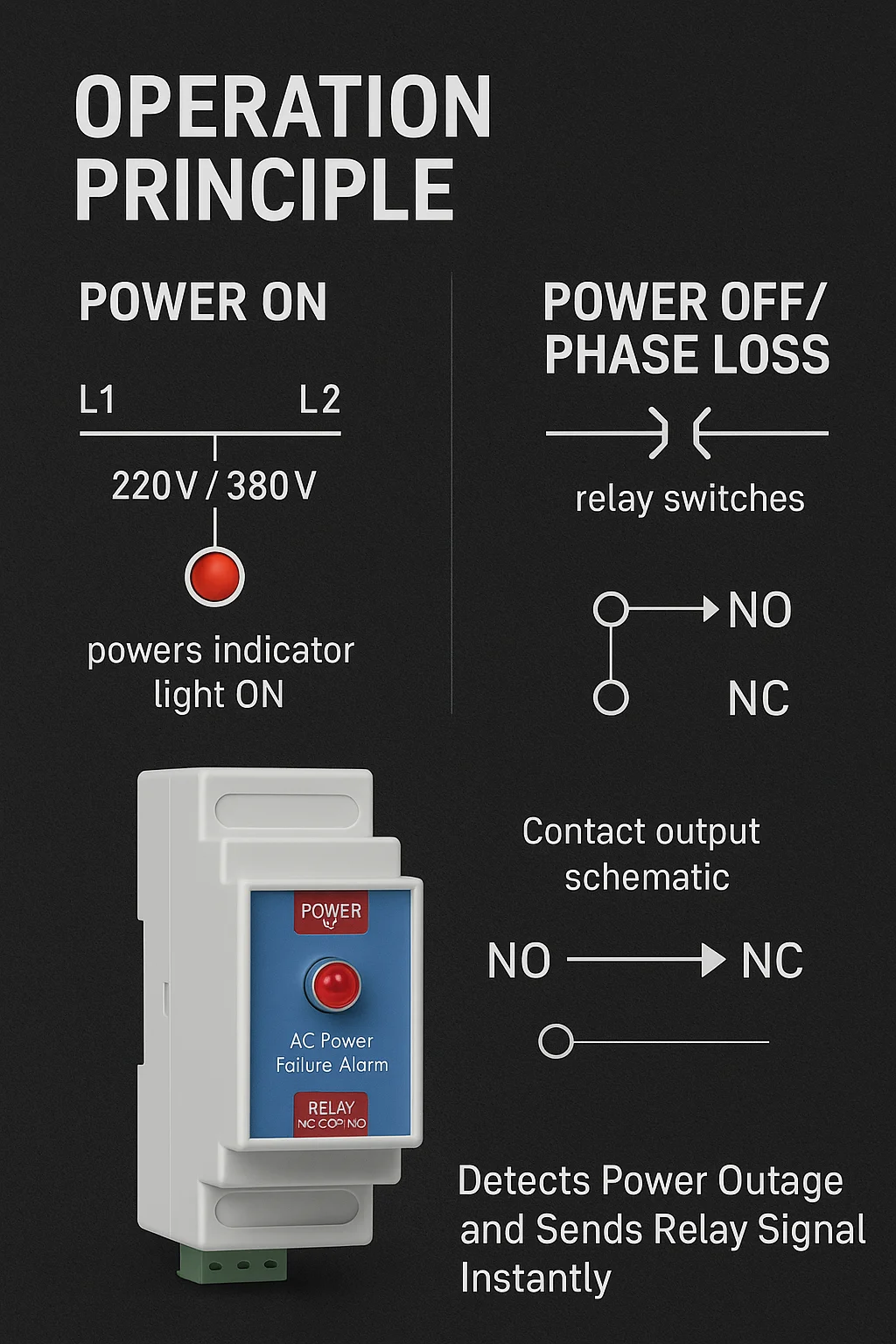 When the monitored power supply fails, the internal relay switches state and outputs a clear, stable signal.