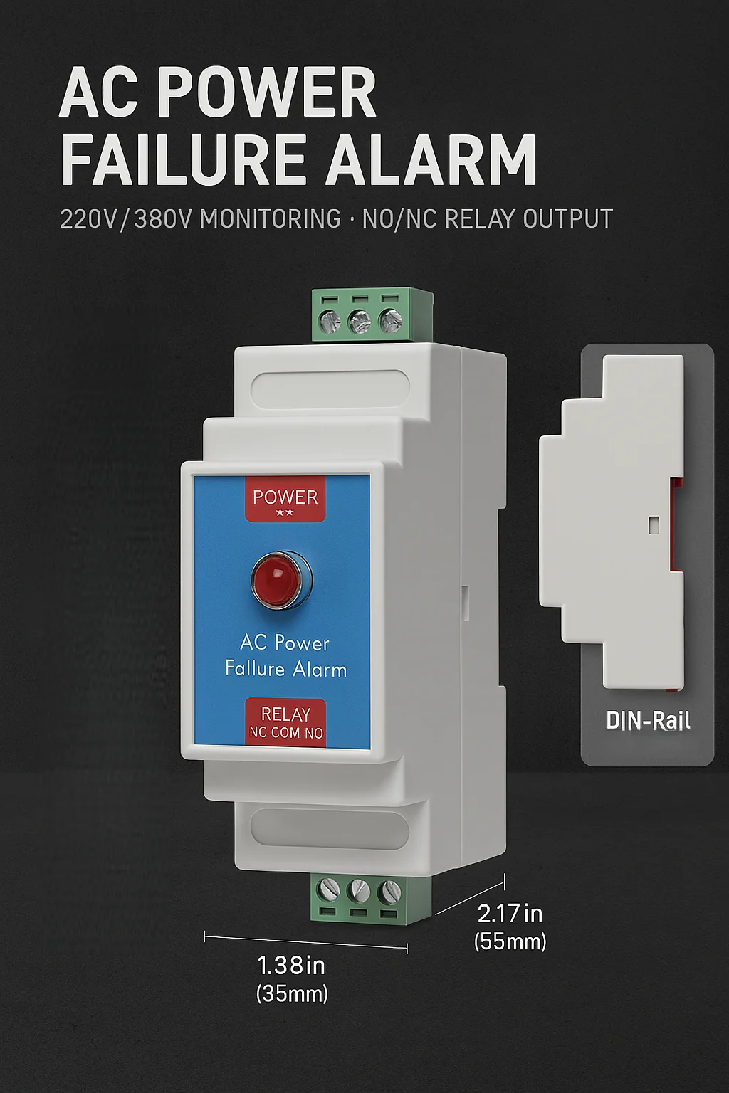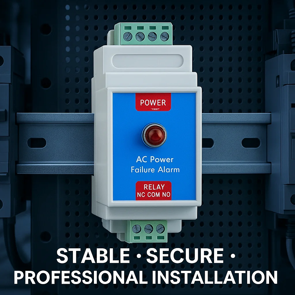 The AC Power Failure Sensor (Model BSG100) is a compact and reliable monitoring device designed to detect 220–380VAC power interruption, phase loss, or voltage drop. It outputs a dry-contact relay signal, enabling seamless integration with industrial control systems, alarm hosts, PLCs, GSM dialers, IoT gateways, and remote monitoring systems.