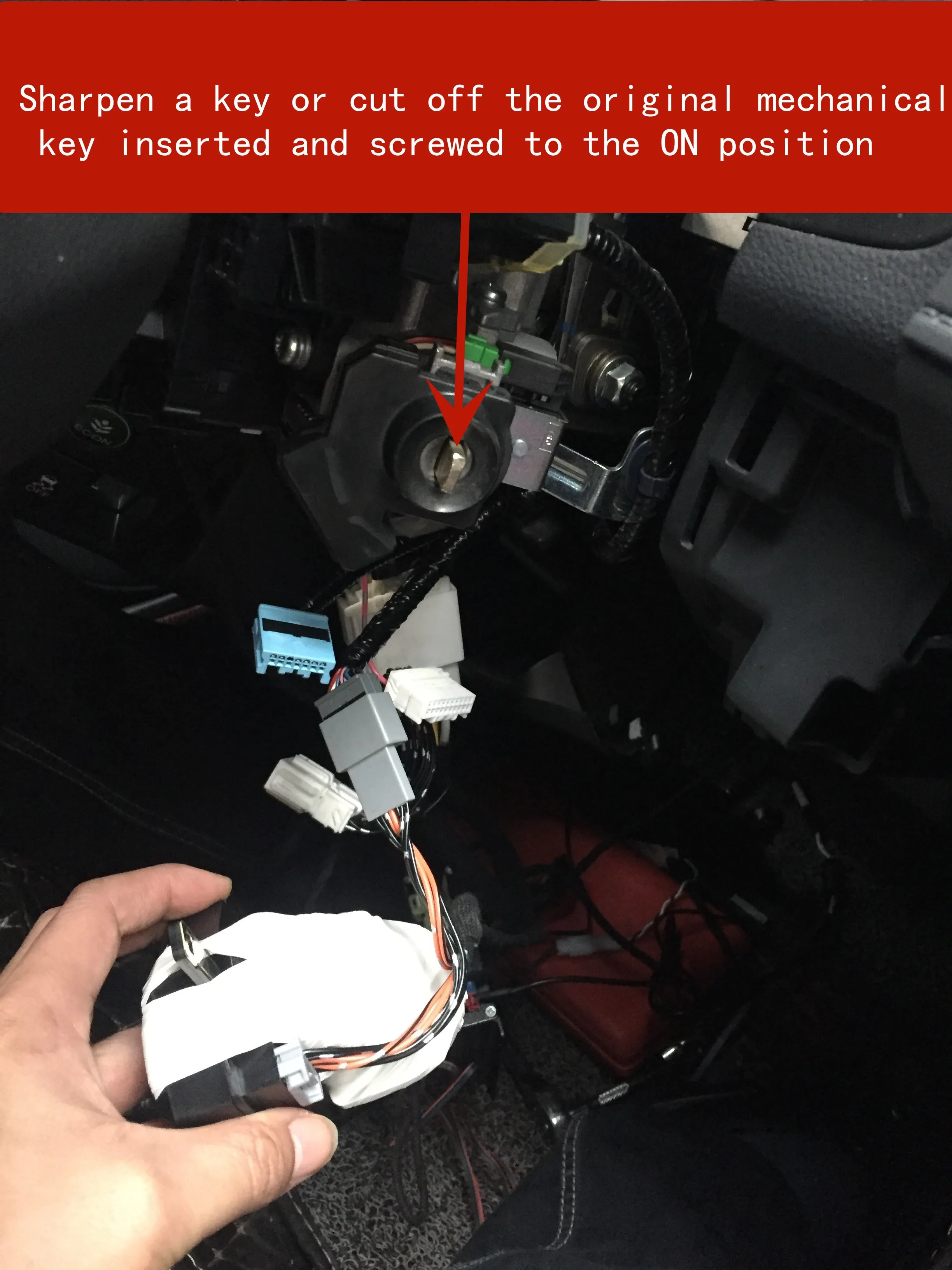 Sharpen a key or cut off the original mechanical key inserted and screwed to the ON position