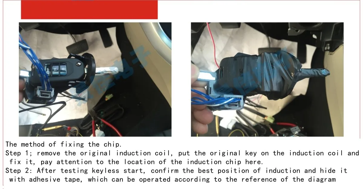 Step 2: After testing the keyless start, confirm the best position of induction, wrap it with tape to finish and hide it inside. You can refer to the operation according to the illustration.