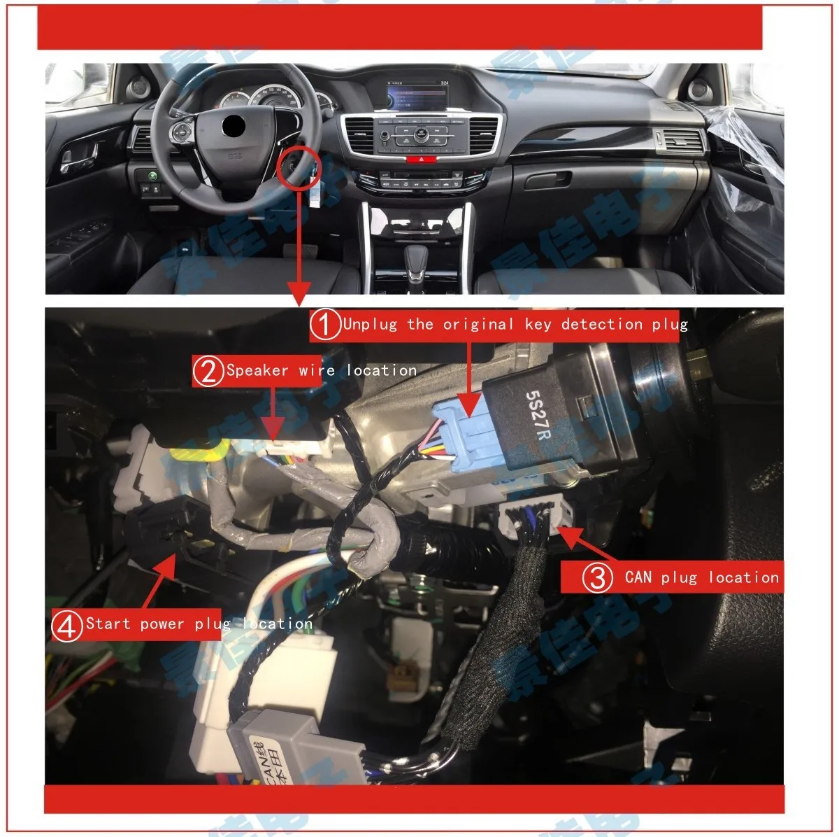 ①Unplug the original key detection plug   ②Speaker wire location   ③CAN plug location     ④Start power plug location