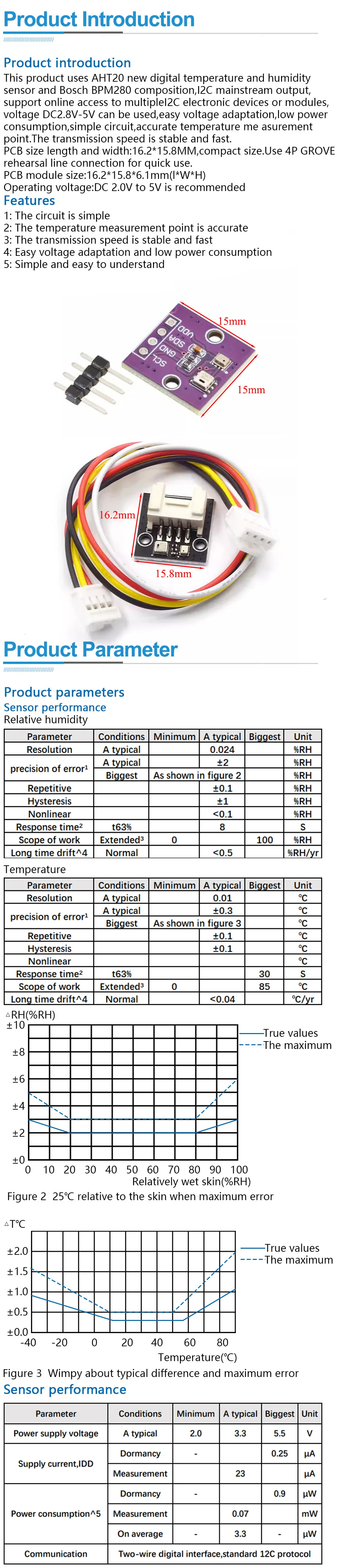 This product is composed of new AHT20 and BPM280 digital temperature and humidity sensors,I2C main output,and supports simultaneous online access to multiple I2C electronic devices or modules. It can use DC 2.8V-5V voltage,the voltage is easy to adapt,the power consumption is low,the circuit is simple,and the temperature measurement point is accurate. The transmission speed is stable and fast.