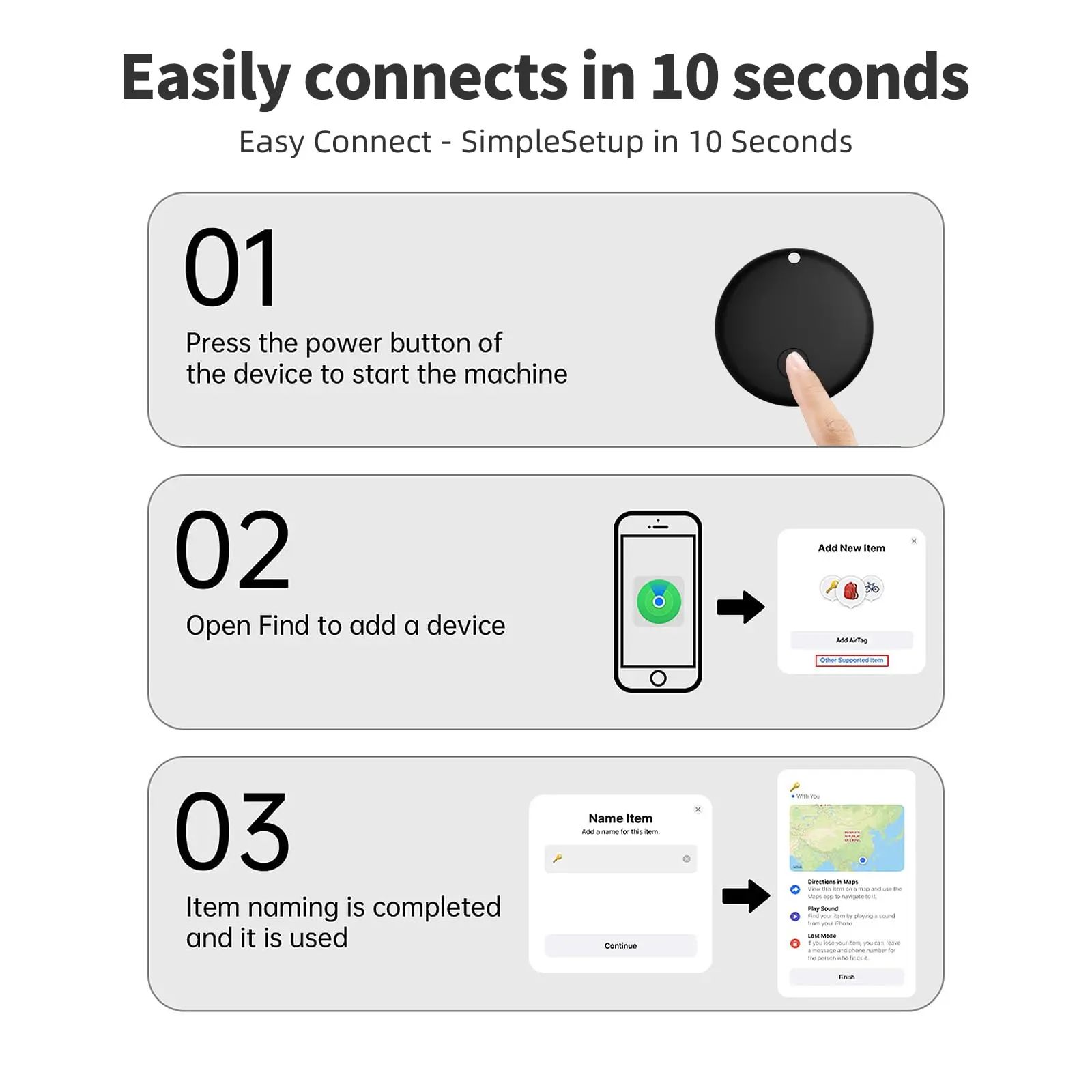 Pull out the battery insulation sheet → Open “Find My” → Click “Add Item” → Close to iPhone to complete pairing