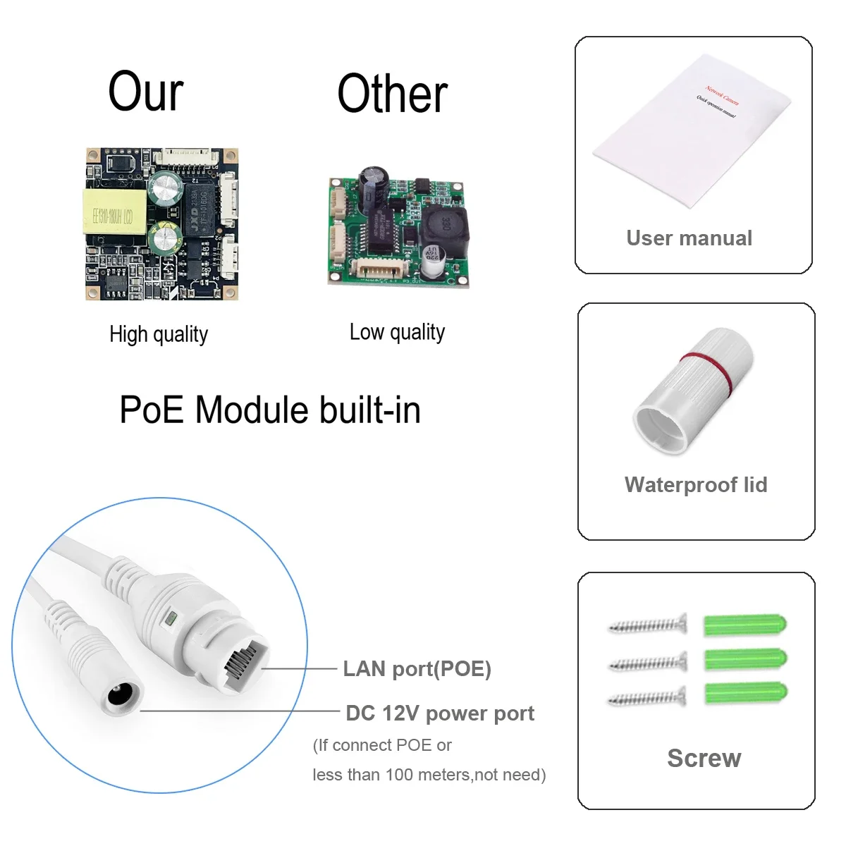 6.Installation is very simple, plug and play,IP cameras only need a single Cat5e ethernet cable to connect it to a compatible NVR for video, power and a stable network connection.