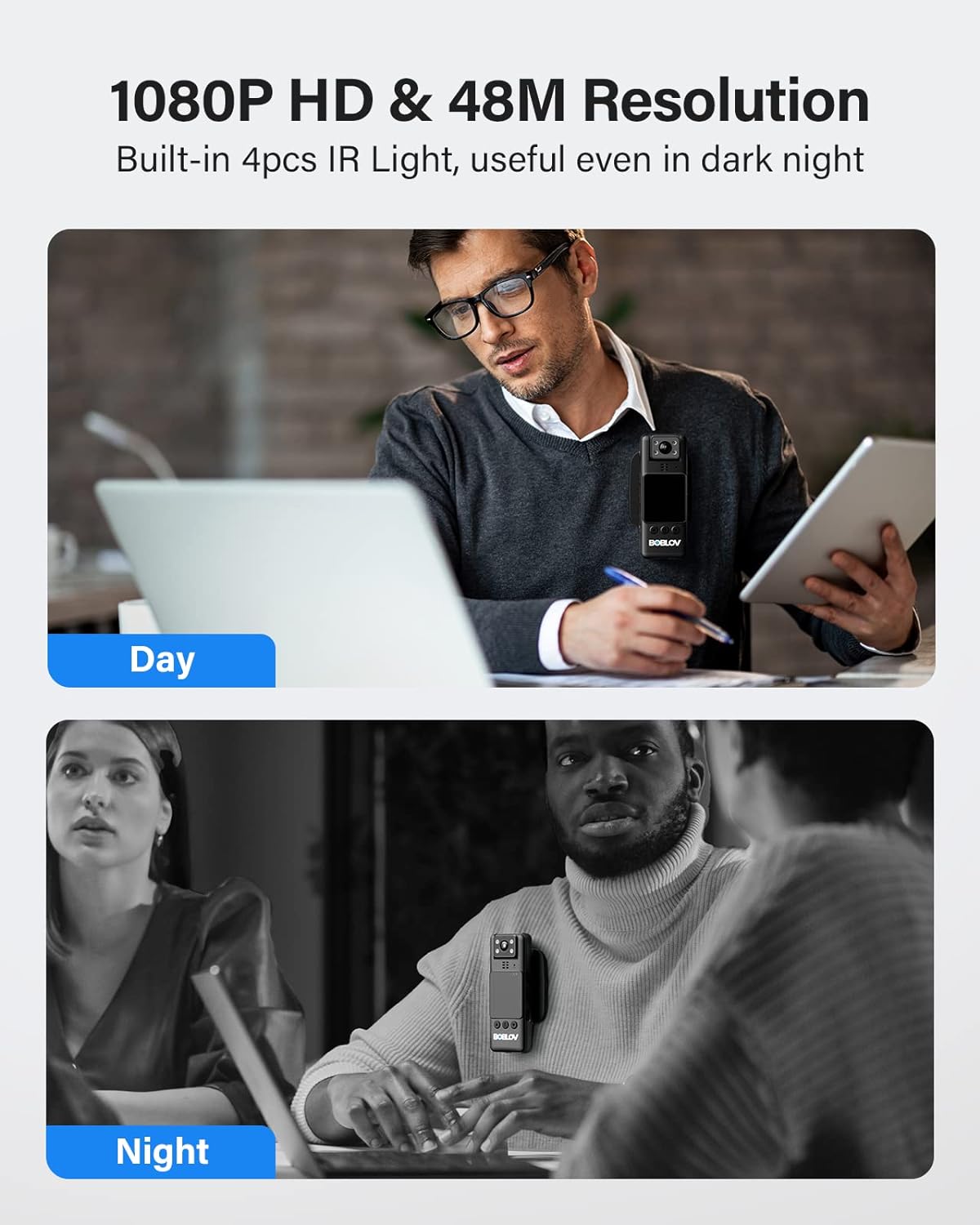 【1080P Video Recorder with 2-in Display】Features 1080P HD video resolution and 48 Megapixels photo of BOBLOV camera, A23 wearable camera provides crisp images either on your daily recording of life or helps to quickly get the evidence of law enforcement, dispute resolved, security guard, patrolling, etc. And you could quickly playback the recording on the camera itself with its display design.