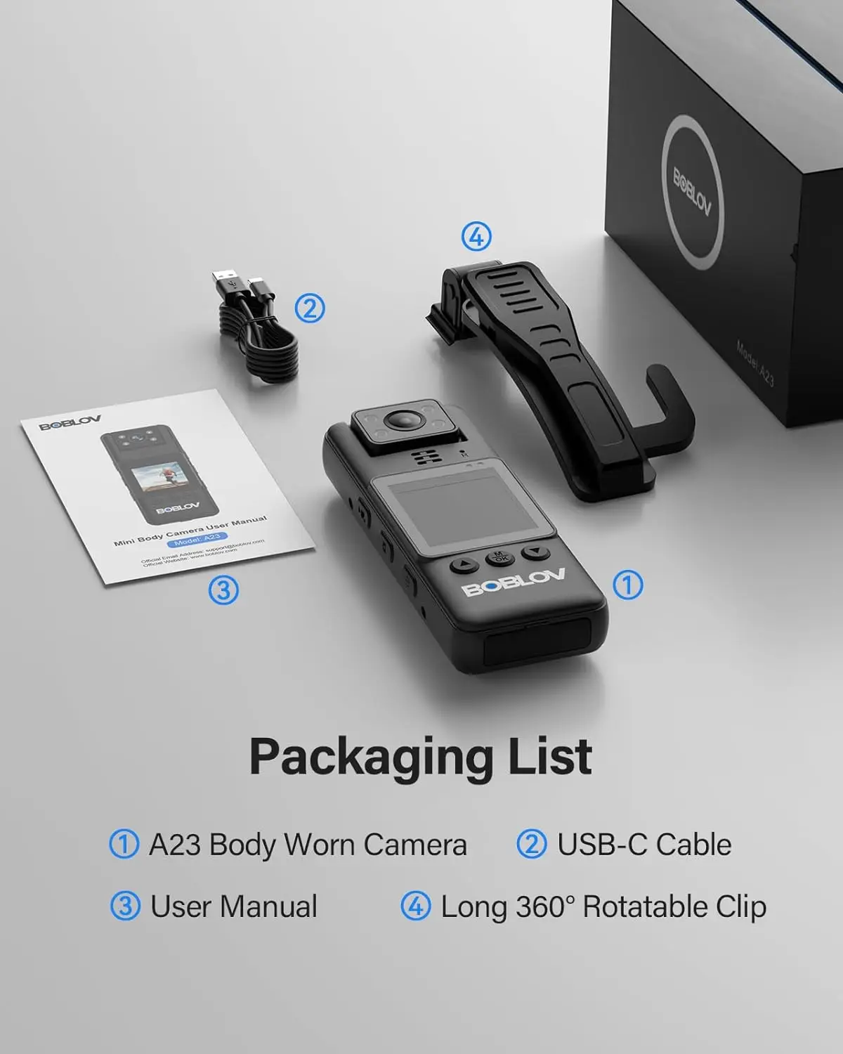 【Durable Vidoe Equipment & Prompt and Informative Customer Service】Package include 1x A23 Body Worn Camera, 1x USB-C Cable, 1x Long 360° Clip, and 1x User Manual, BOBLOV provides a two-year warranty for high-value products, with no worry for after-sale.