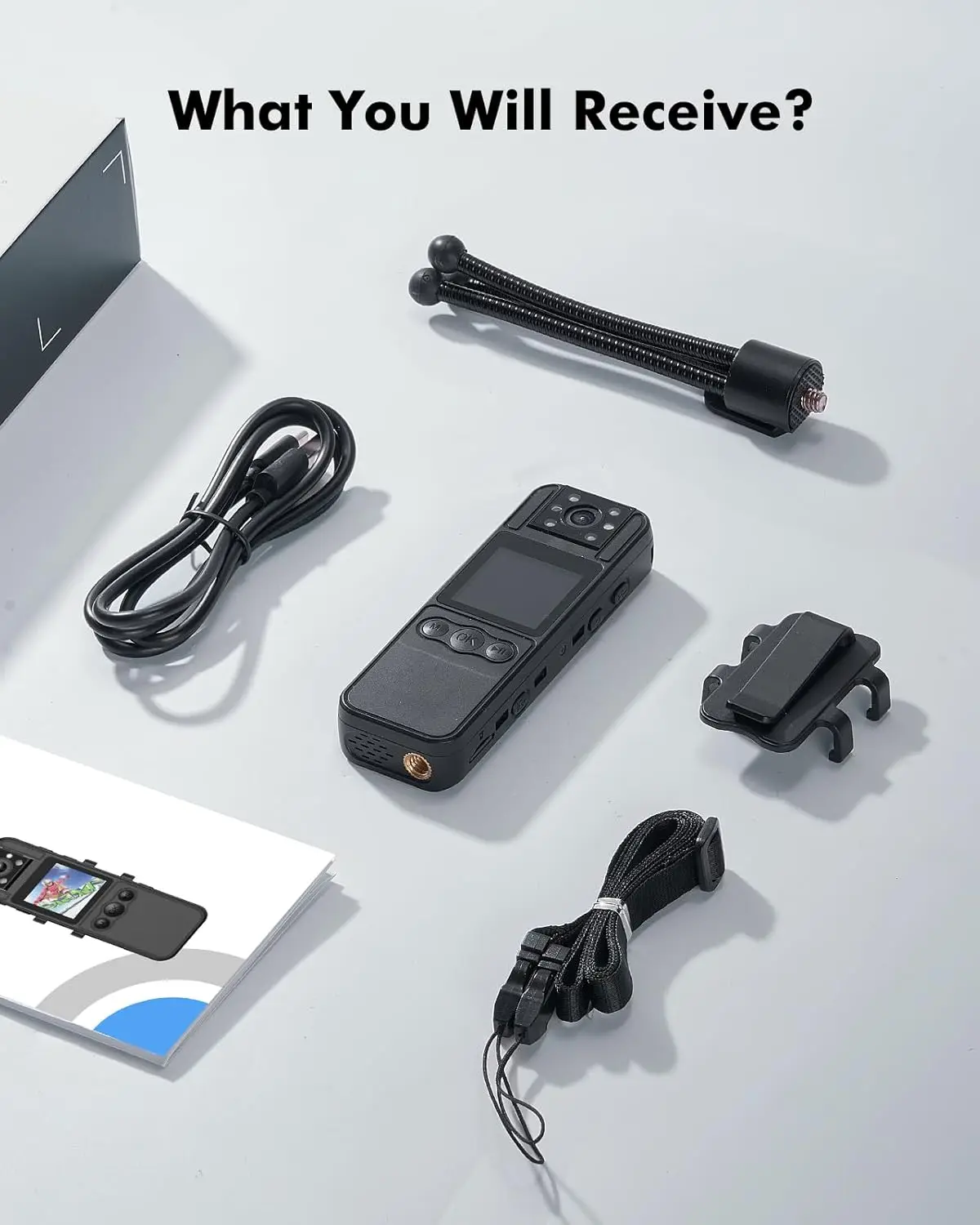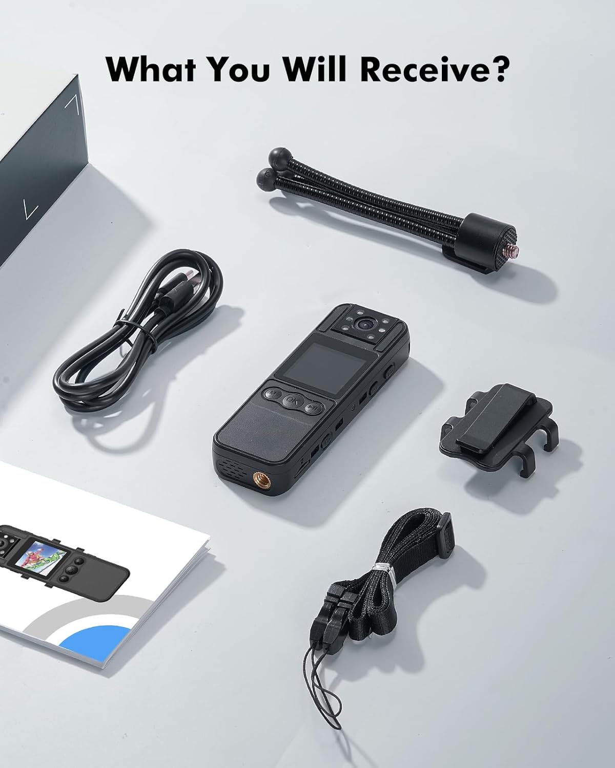 • Complete Package for Enhanced Functionality: The BOBLOV A27 body camera comes with everything you need to get started, including a tripod for stable hands-free operation, a back clip for easy attachment, a lanyard for comfort, a USB-C cable for quick charging, and a user manual for simple setup and use