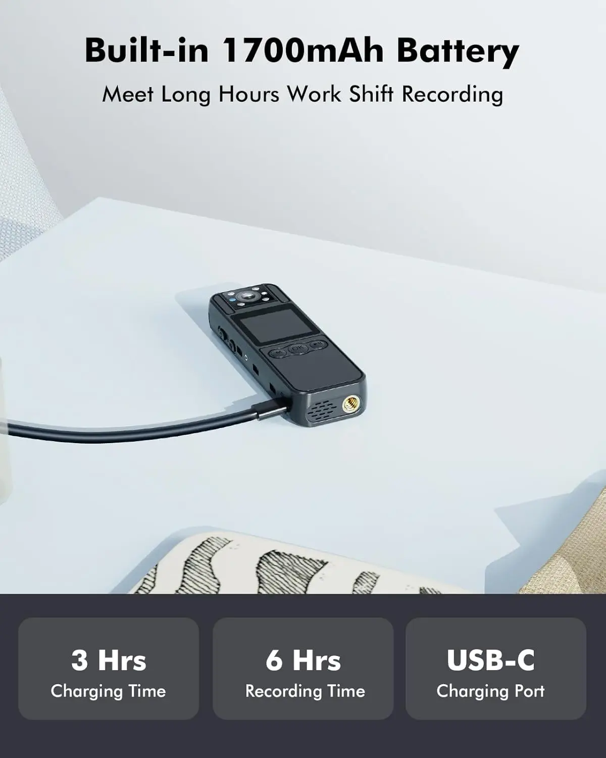 • Extended Recording with 1700mAh Battery: Equipped with a robust 1700mAh battery, the A27 body camera provides up to 6 hours of continuous recording. Perfect for long shifts or extended surveillance, it ensures you have all the footage you need without interruptions. Plus, the included tripod offers hands-free use for added convenience