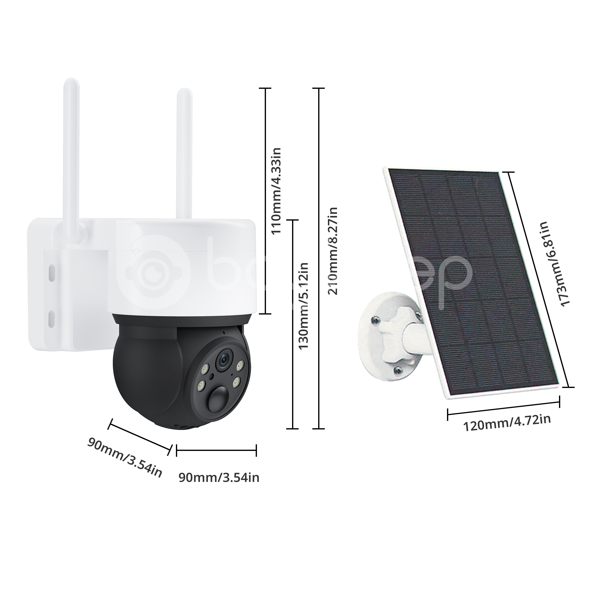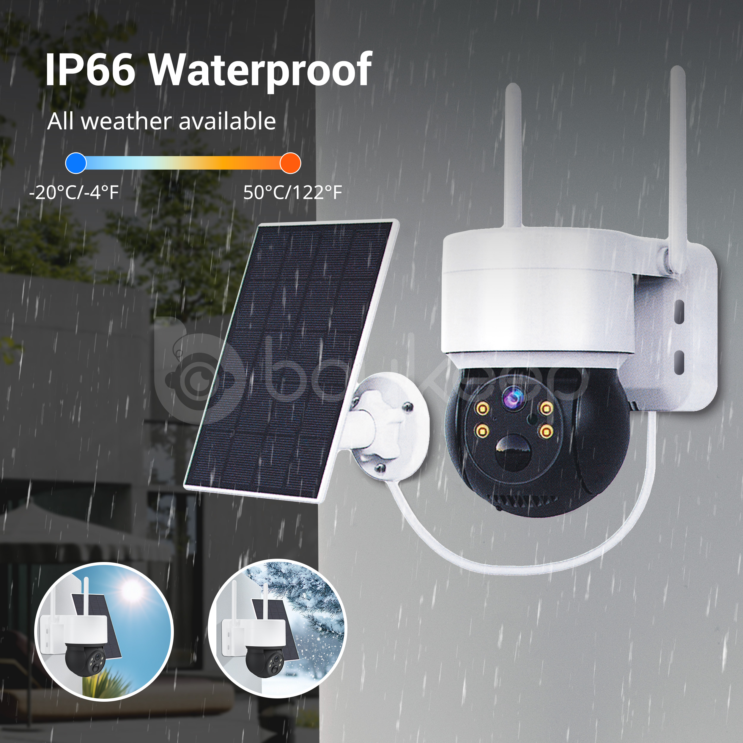 Equipped with a built-in rechargeable battery and IP66 rating, this camera is solar powered and weatherproof, ideal for outdoor use.