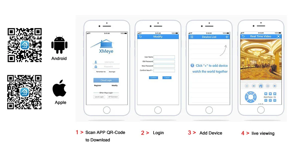 Easy setting , just 4 steps for mobile phone viewing,View live video of the system from anywhere and anytime via you smarphone,