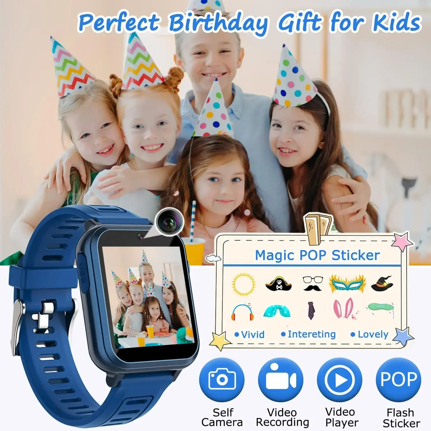 Kids smartwatch equipped with camera. Children can take photos and record videos, capture record every joyful moment.