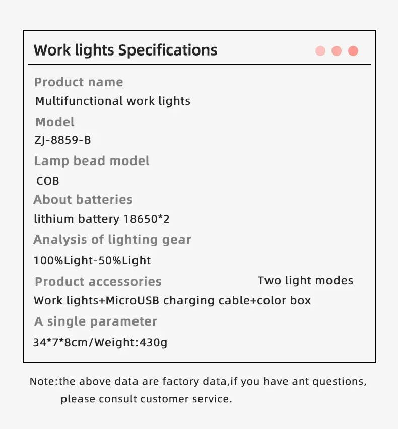 Luminous mode: COB white light (strong light – weak light), patch lamp bead red light flashing