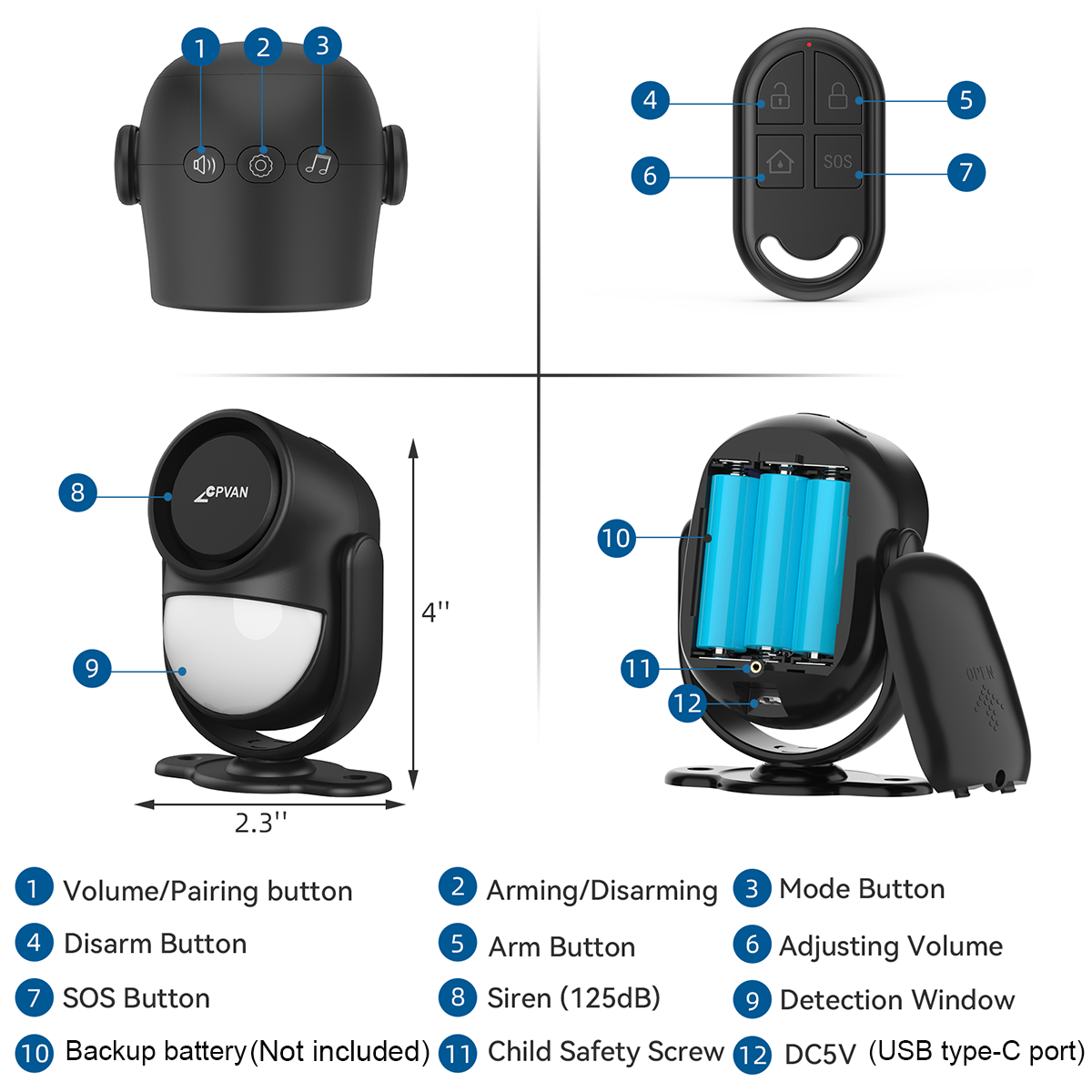 Alarm options and power supply mode: There are two types of alarm settings:chime function and alarm function. During the day, when using the chime sound, it serves as a chime sound. At night, when you switch the sound from chime to alarm sound, it will deter burglars and inform you. Power mode: This alarm is powered through USB (USB Type-C cable), and it can also accommodate backup batteries (not included in the package).