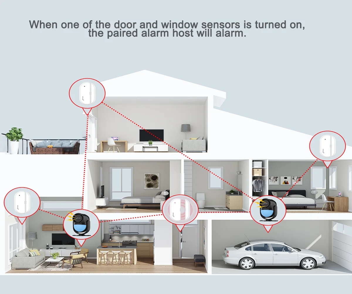 Notice: You can pair a remote control with multiple alarm hosts and control multiple alarm hosts, or use two remote controls to control one alarm host after pairing. You can also pair one door/window alarm or multiple door/window alarms with multiple alarm hosts. After one door/window alarm alarms, the paired alarm hosts will simultaneously alarm . The volume of alarms and ringtones can be adjusted through the volume button on the host or the remote control.