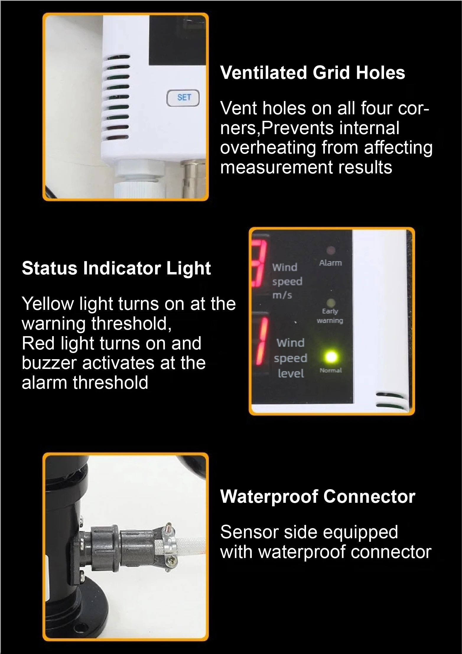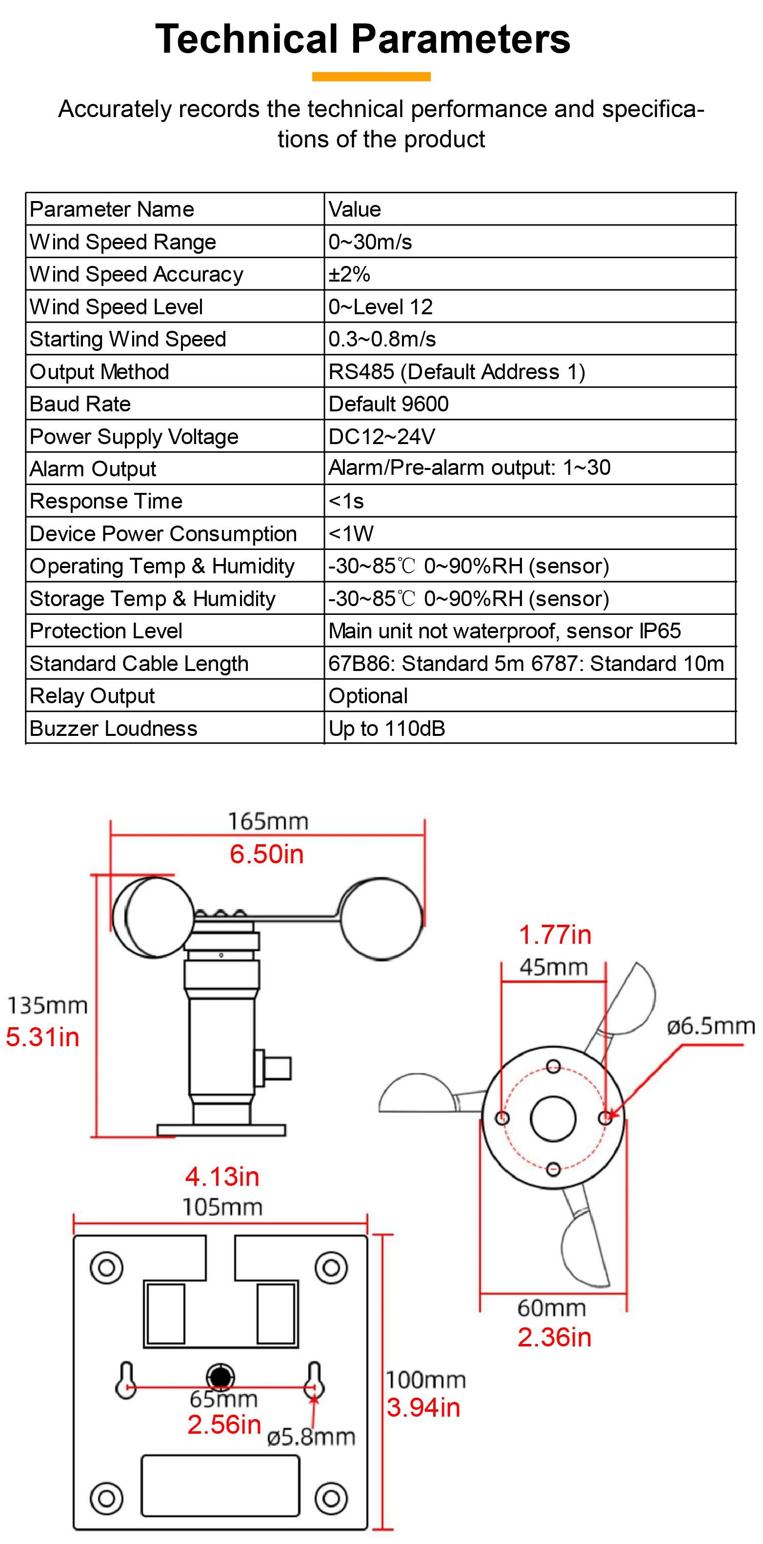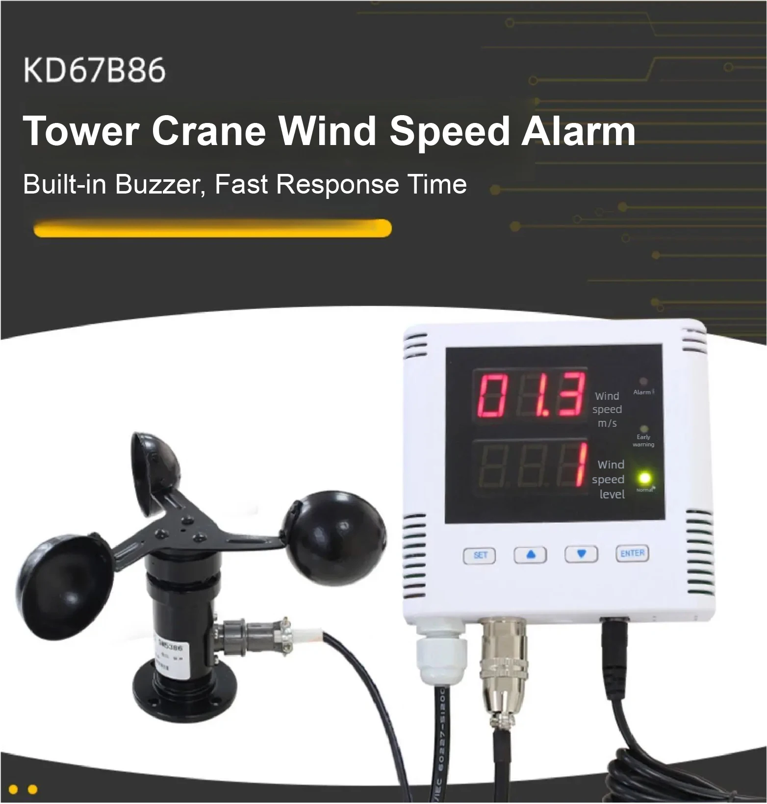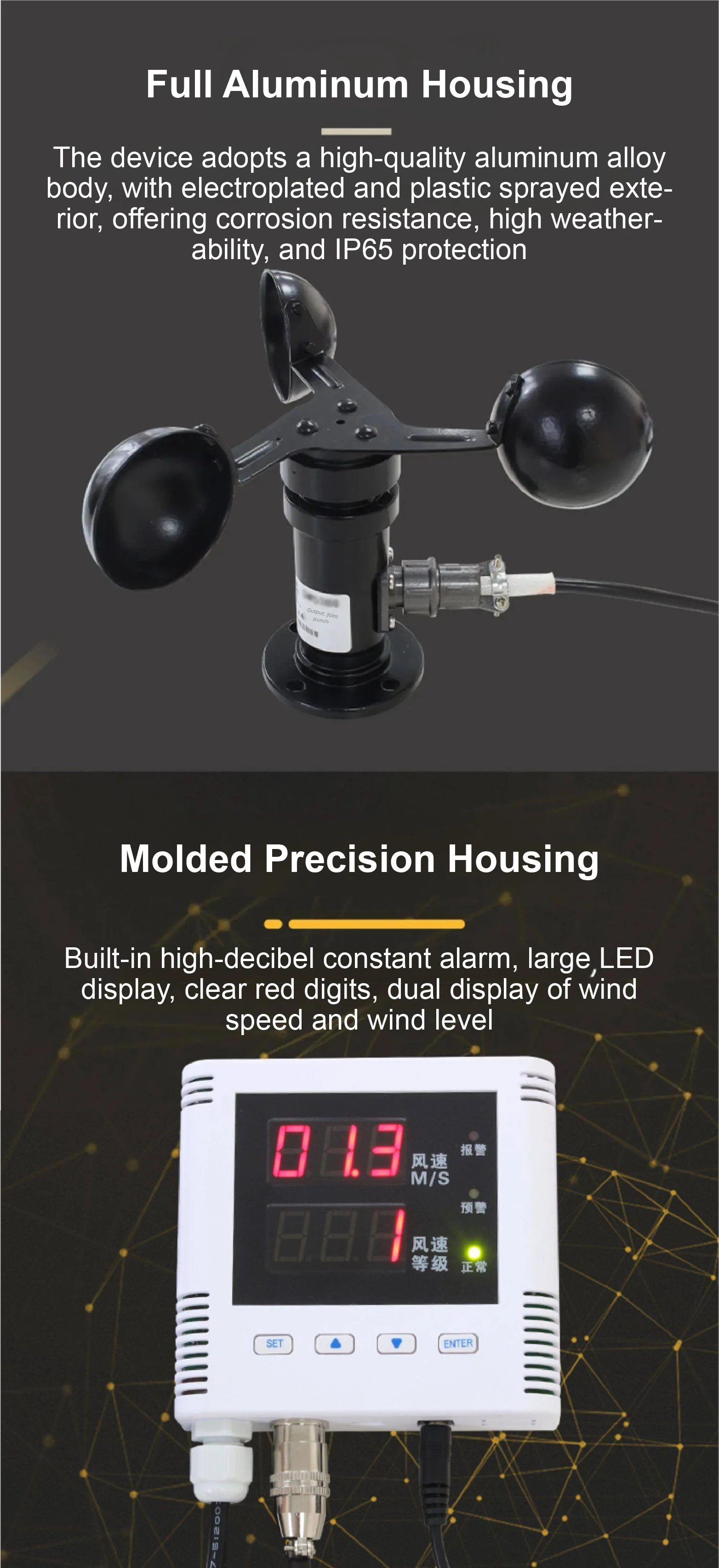 High-precision wind speed alarm system with real-time LED display and a 110dB buzzer alert. Built for industrial-grade applications, this device delivers accurate and reliable wind monitoring with a durable aluminum alloy housing, an IP65-rated sensor, and a 360° cup-style measuring structure.