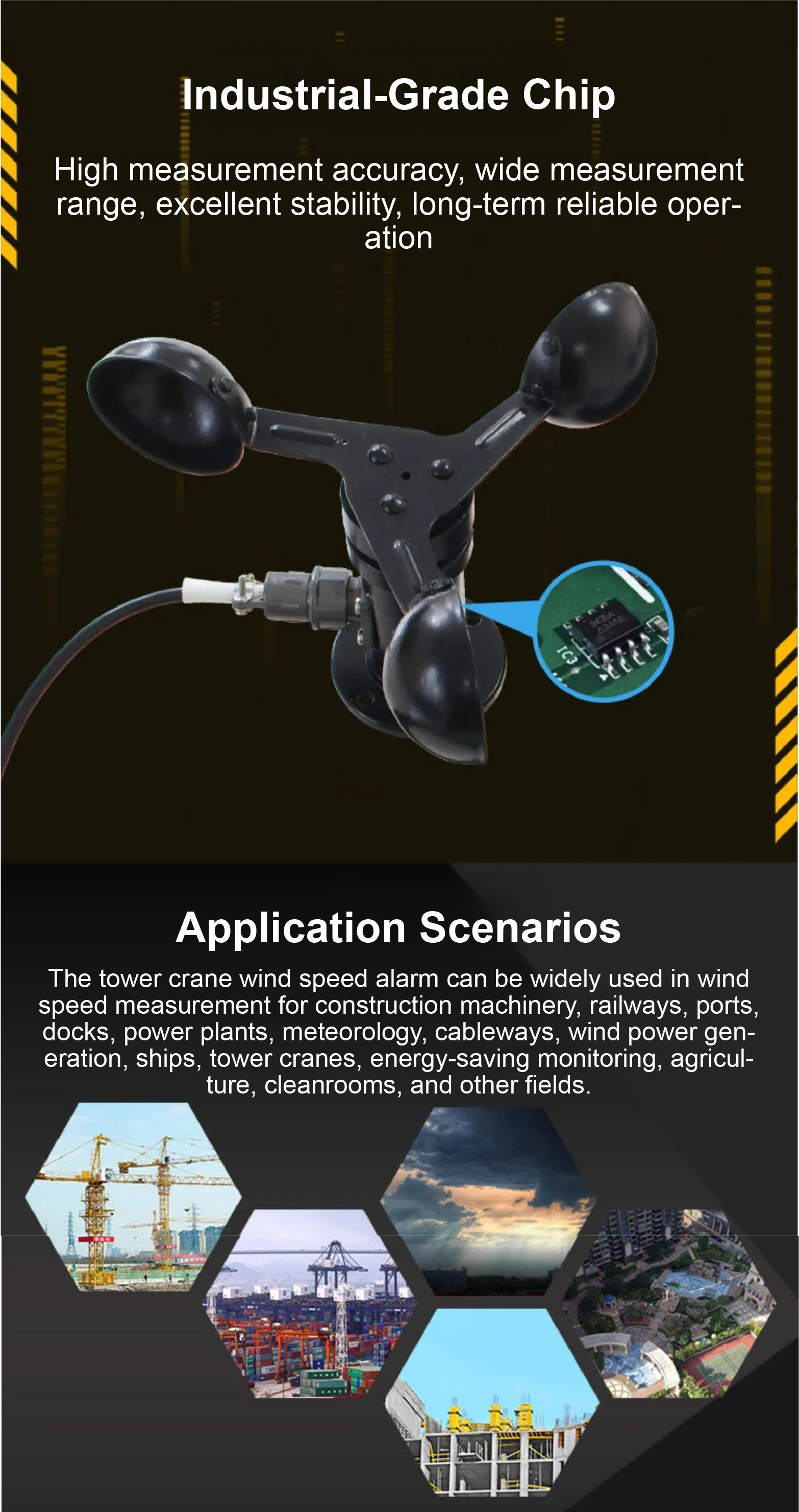 Widely used across multiple industries, this system is ideal for tower cranes, construction machinery, ports, railways, wind power systems, weather stations, ships, cableways, power plants, agriculture, cleanrooms, and energy monitoring systems. Designed to meet diverse operational needs, it provides reliable wind speed monitoring in both industrial and environmental applications.