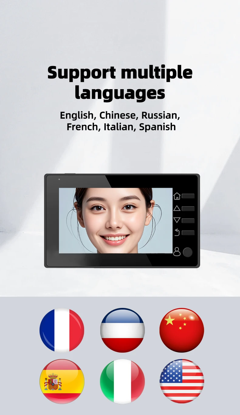 3.This product has six languages, including English, Chinese, Russian, French, Italian, and Spanish, which can be changed in the settings.