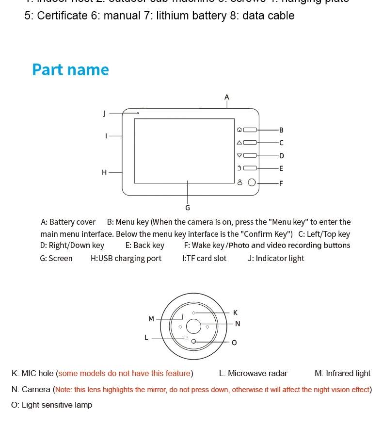 1.The first button is the menu button and the confirm button. Clicking the menu button will enter the main menu interface. The photo mode and video mode are the same icon. After selecting them, press the menu button to switch. The recording mode requires a card to be inserted before it can be used.