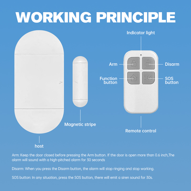 Multi-device interconnection mode: One remote control can control multiple door status sensors. Or a door magnetic alarm can be connected to multiple remote controls.