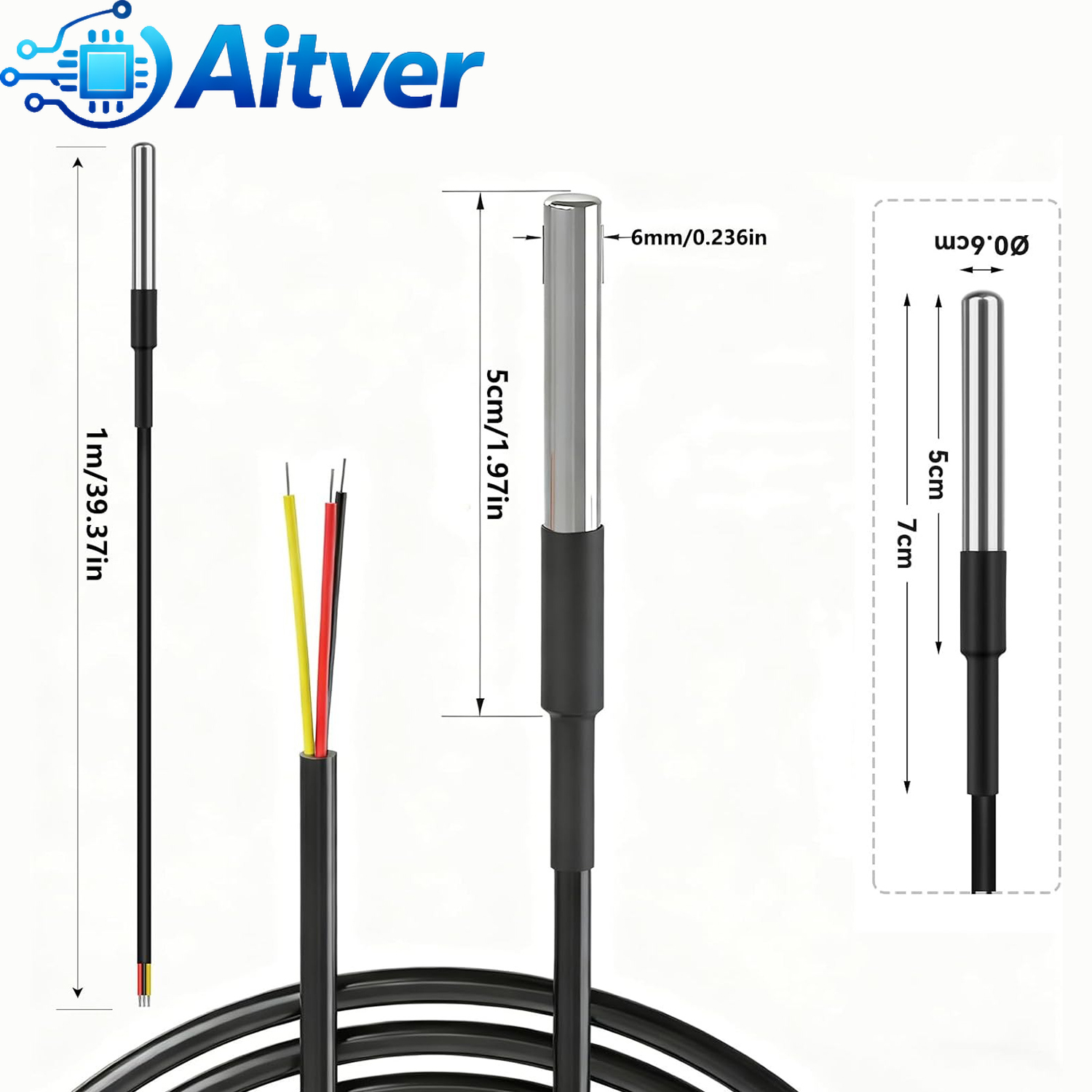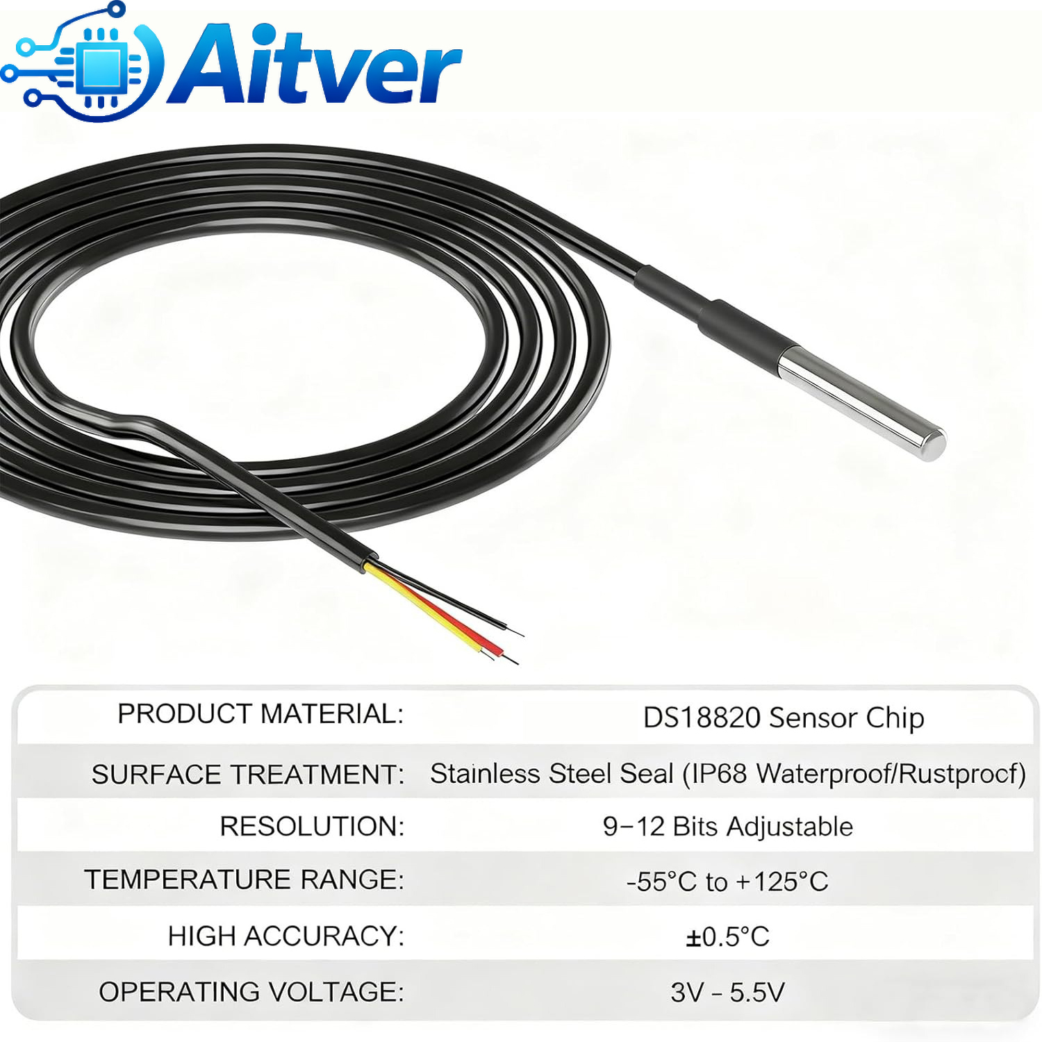High‑accuracy digital temperature sensor with stainless steel waterproof probe and 3‑wire cable. Ideal for Arduino, ESP32, Raspberry Pi, and DIY electronics projects.