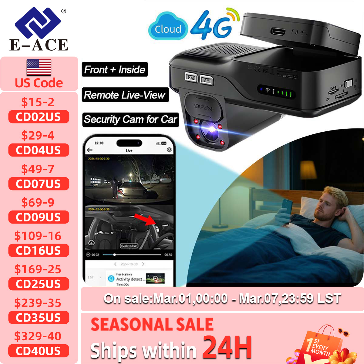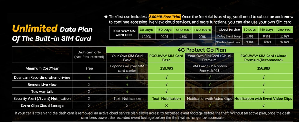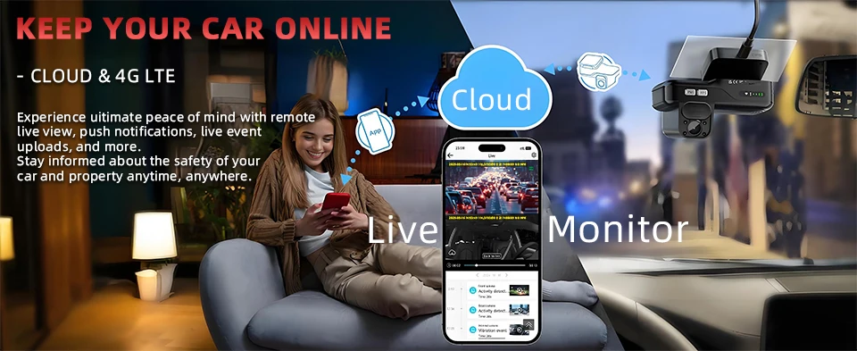 Function: Night Vision, WDR, Full Color, Park Mode, Loop Recording, App Control, Voice Interaction, Emergency Accident Lock, Built-In GPS, Cloud Storage, LTE Cloud Monitoring,Motion detection,Sentry Mode,Dual FHD Dash Camera