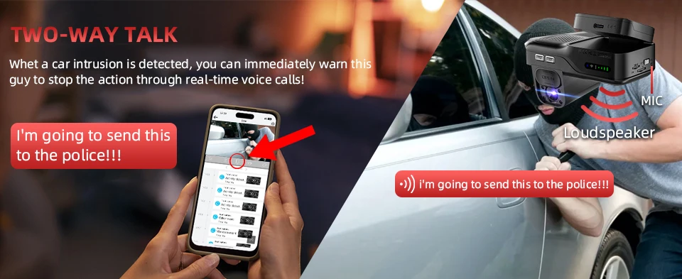 When vehicle intrusion is detected, instantly deter potential threats through live voice communication – directly from your smartphone to the B65's built-in speaker.