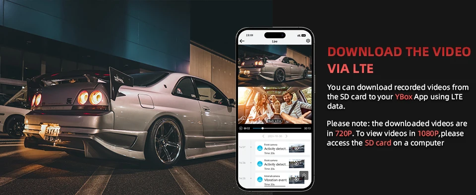Remotely download recorded footage from your dash cam's SD card directly to your YBox App using LTE connectivity – no need to physically retrieve the memory card.