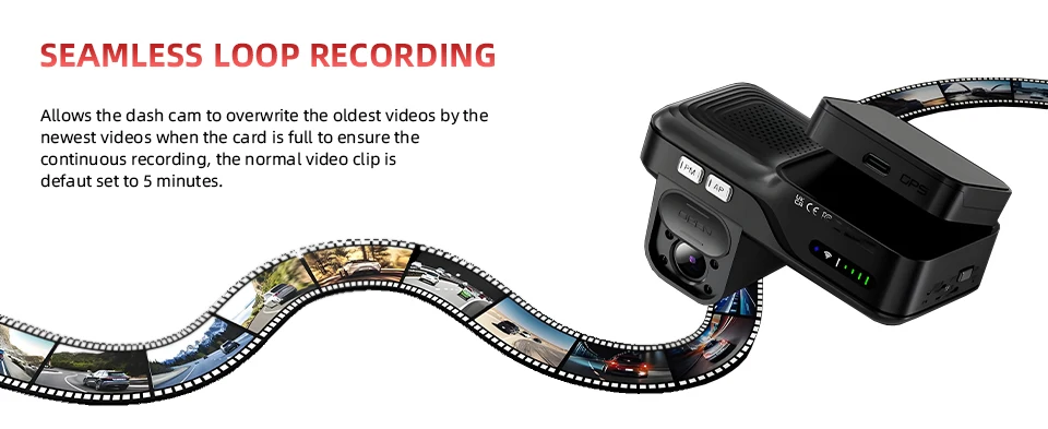 Your dash cam automatically overwrites the oldest footage when the memory card is full, ensuring uninterrupted recording. By default, videos are saved in 5-minute clips for optimal storage management.