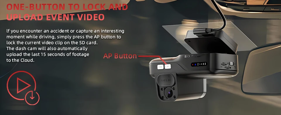 Simply press the AP button to instantly lock the current video clip and auto-upload it to the cloud. Whether it's an emergency incident or a memorable moment, your dash cam will securely save the last 15 seconds of footage to cloud storage – ensuring important recordings are never lost.
