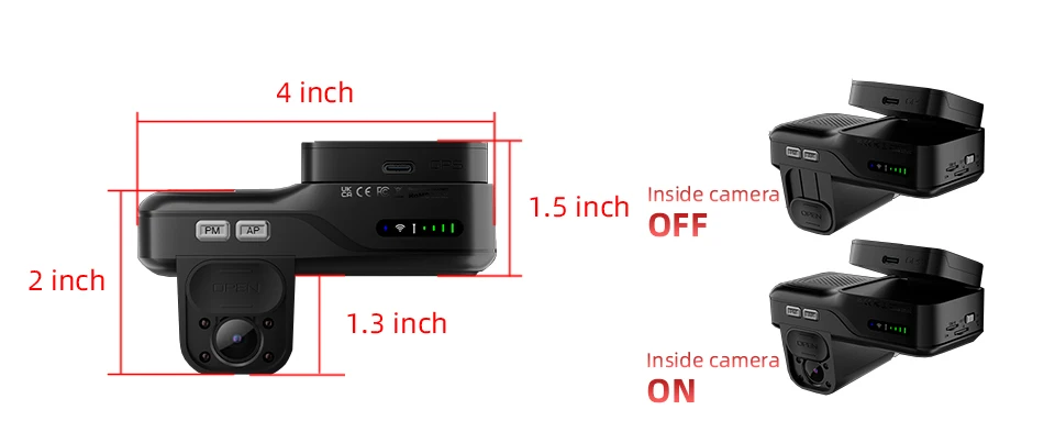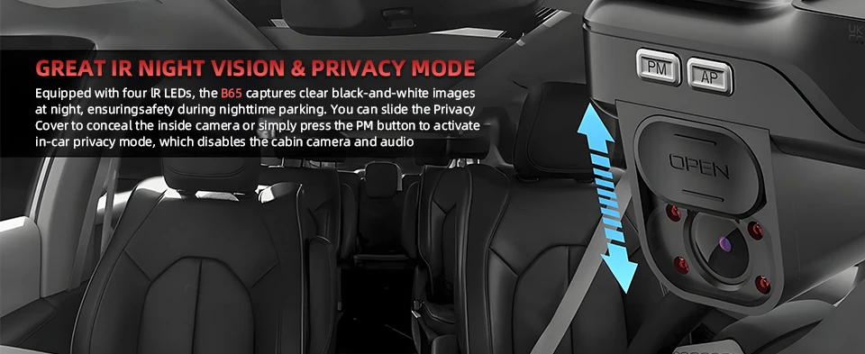 The B65 delivers crisp nighttime security with 4 powerful IR LEDs that capture clear black-and-white footage, keeping your vehicle protected after dark. When privacy matters, simply slide the cover or press the PM button to instantly disable the cabin camera and microphone – giving you complete control over your personal space.