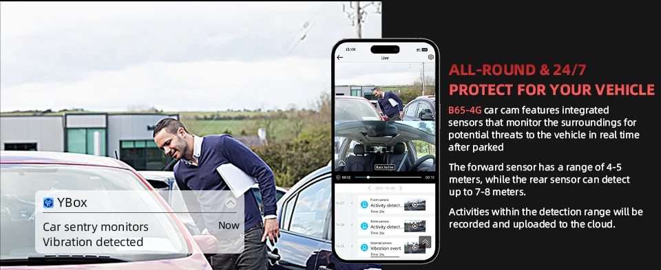 The B65-4G car cam provides comprehensive security for your parked vehicle, featuring advanced integrated sensors that continuously monitor your surroundings in real time. With a 4-5 meter detection range at the front and extended 7-8 meter coverage at the rear, the system vigilantly watches for potential threats. Any suspicious activity within these zones triggers automatic recording and instant cloud uploads, ensuring your vehicle remains protected day and night while keeping you informed wherever you are.