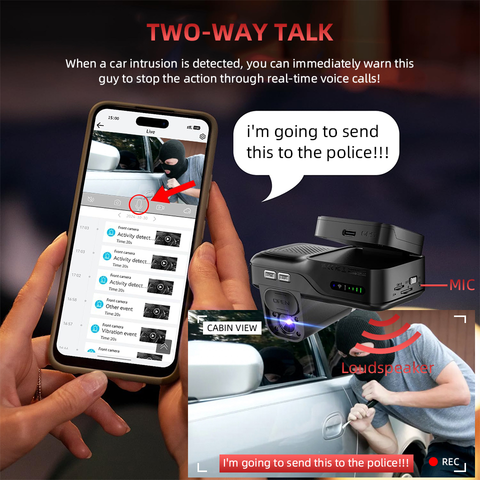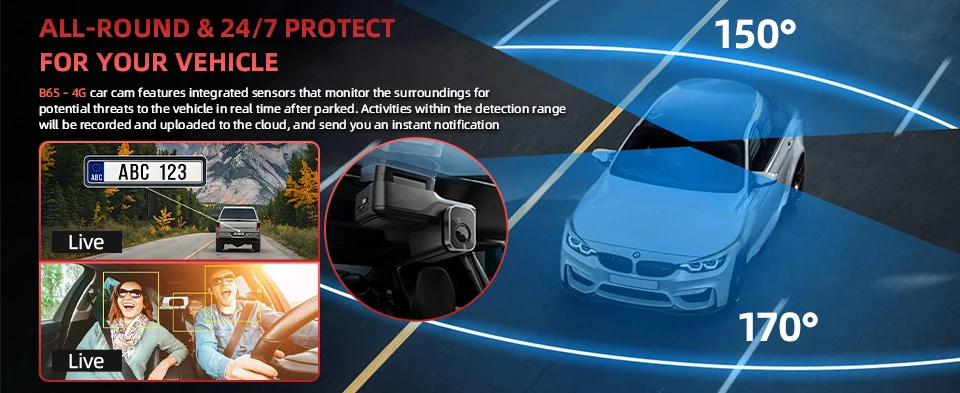 The B65 keeps you connected to your vehicle anywhere in the world through real-time live viewing. Whenever potential threats are detected around your car, you'll receive immediate notifications – empowering you to take instant action through two-way voice communication while automatically preserving critical evidence in the cloud. This complete security solution combines smart monitoring with rapid response capabilities, ensuring your vehicle remains protected day and night.