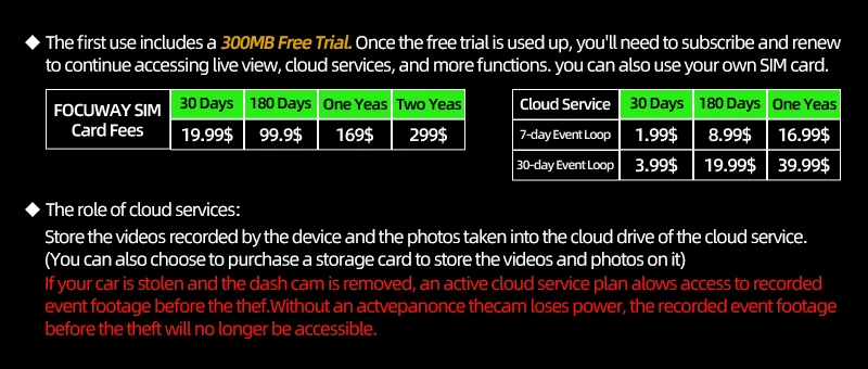 SIM card package fees and cloud service fees: