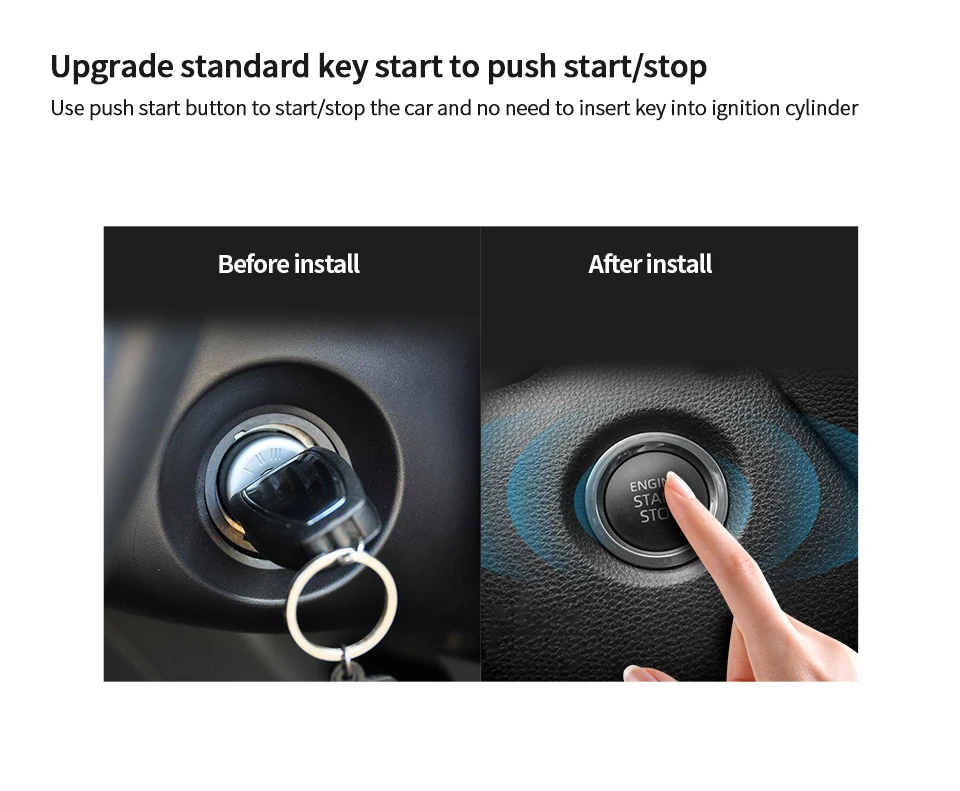 The item fits for 95% DC12V petrol vehicles on the market, but can't work with cars which have factory push button already.