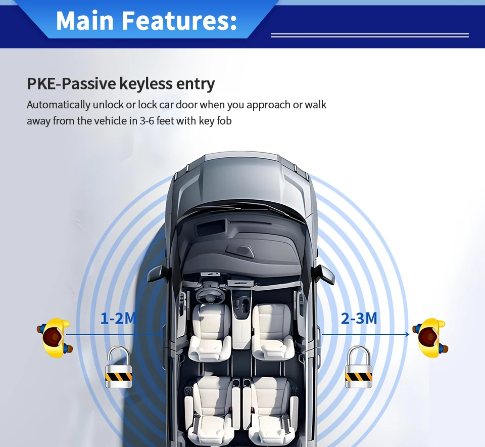 In lock status, keep pressing the lock and unlock button together for about 2s, the siren sounds 4 times means turn on the PKE, siren sounds 3 times means turn off the PKE.