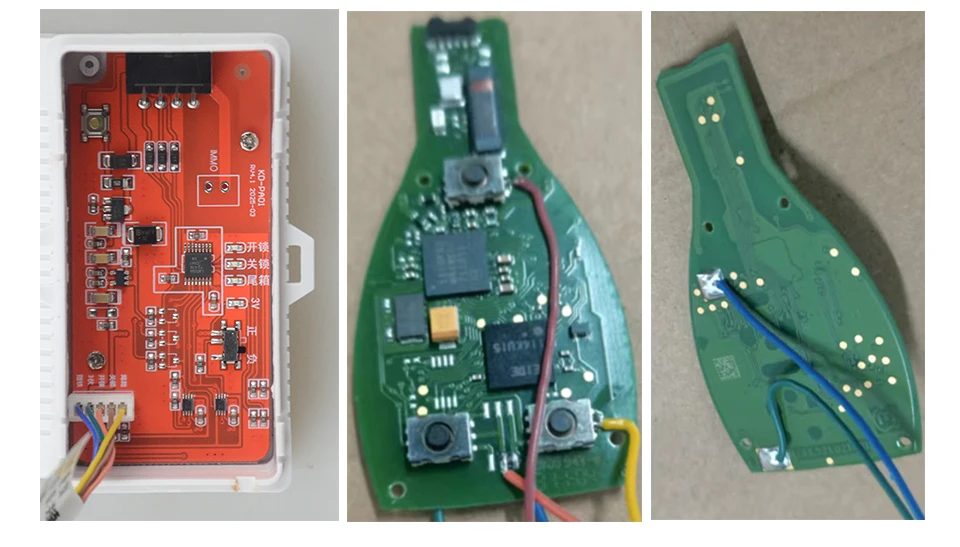 Disassembled the car factory key and put the PCB, then solder the PCB with the bypass wires.