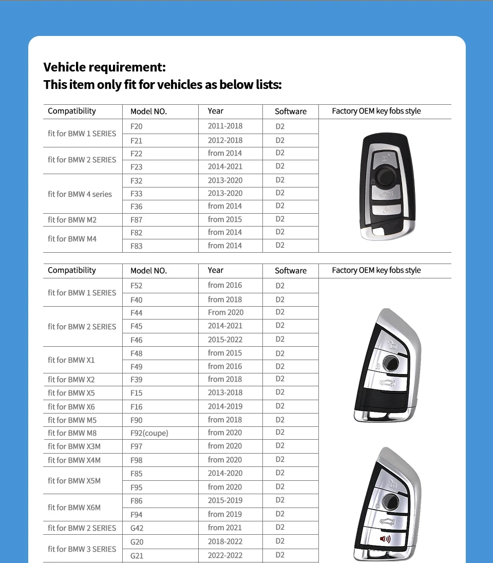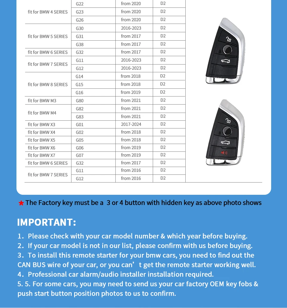if you BMW car with factory OEM push start button near the steering wheel, please buy the D2 version