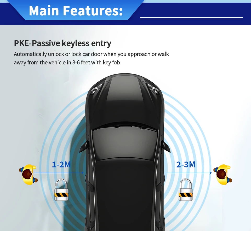 In lock status, keep pressing the lock and unlock button together for about 2s, the siren sounds 4 times means turn on the PKE, siren sounds 3 times means turn off the PKE.