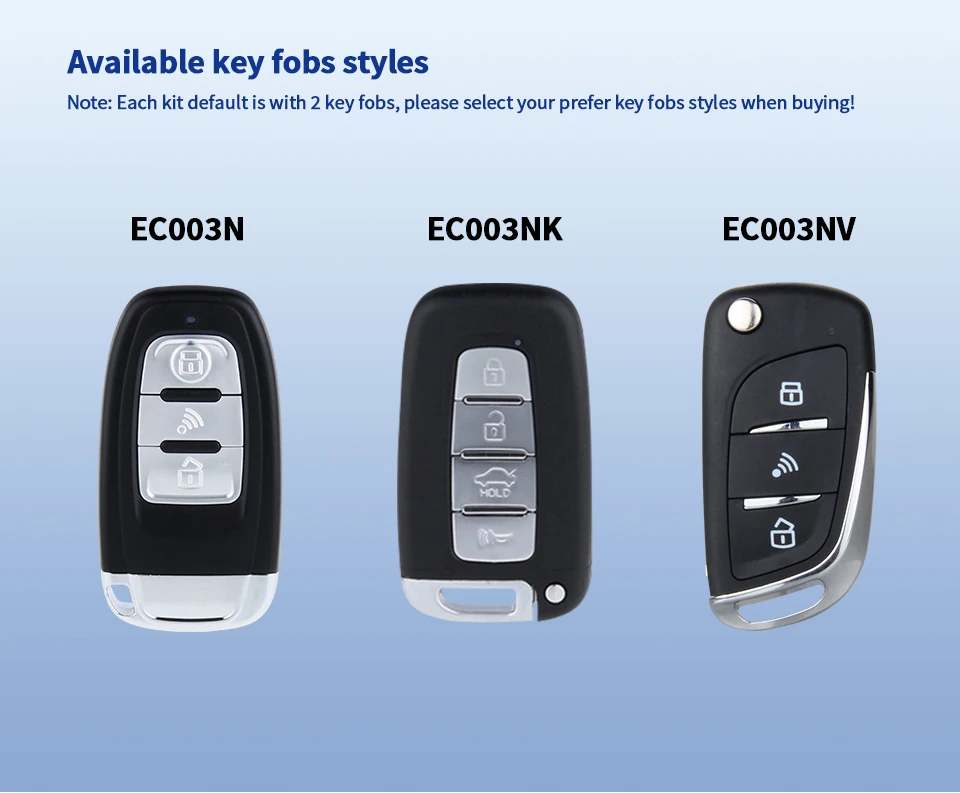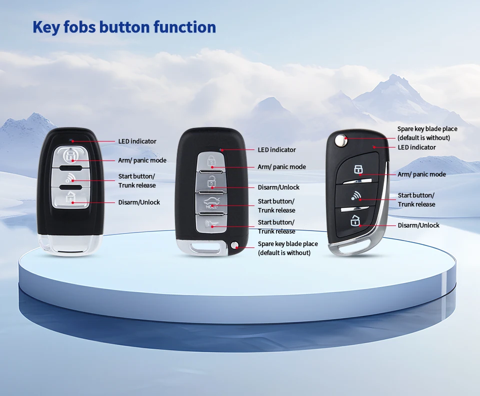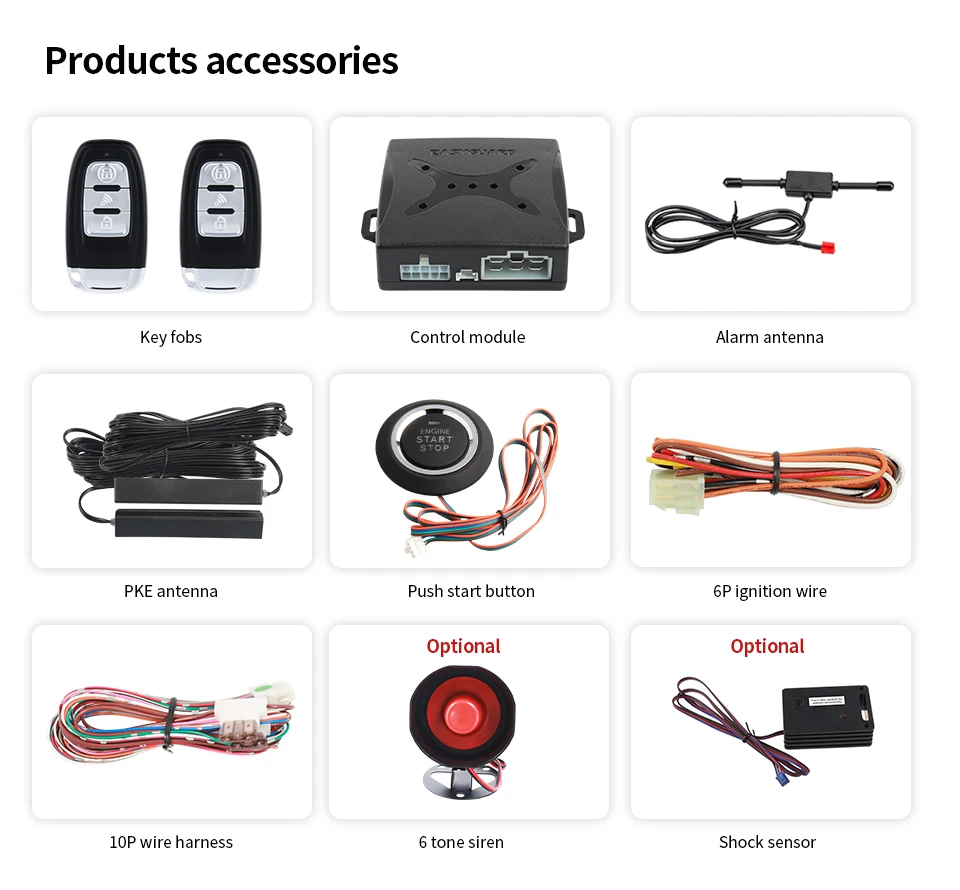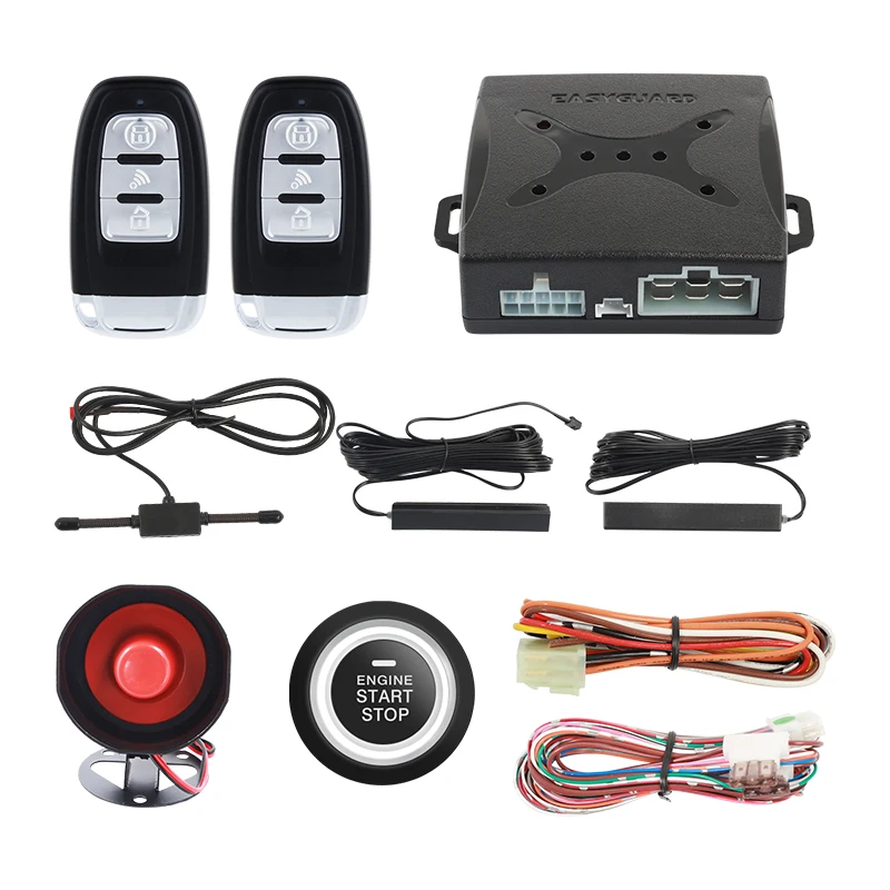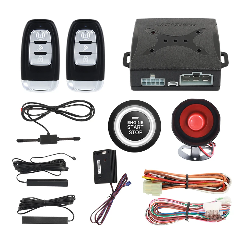 This is an intelligent PKE (passive keyless entry) car alarm with remote engine start and push button start function. It is a universal version and fits for most of automatic and manual transmission vehicles, gasoline and diesel vehices.
