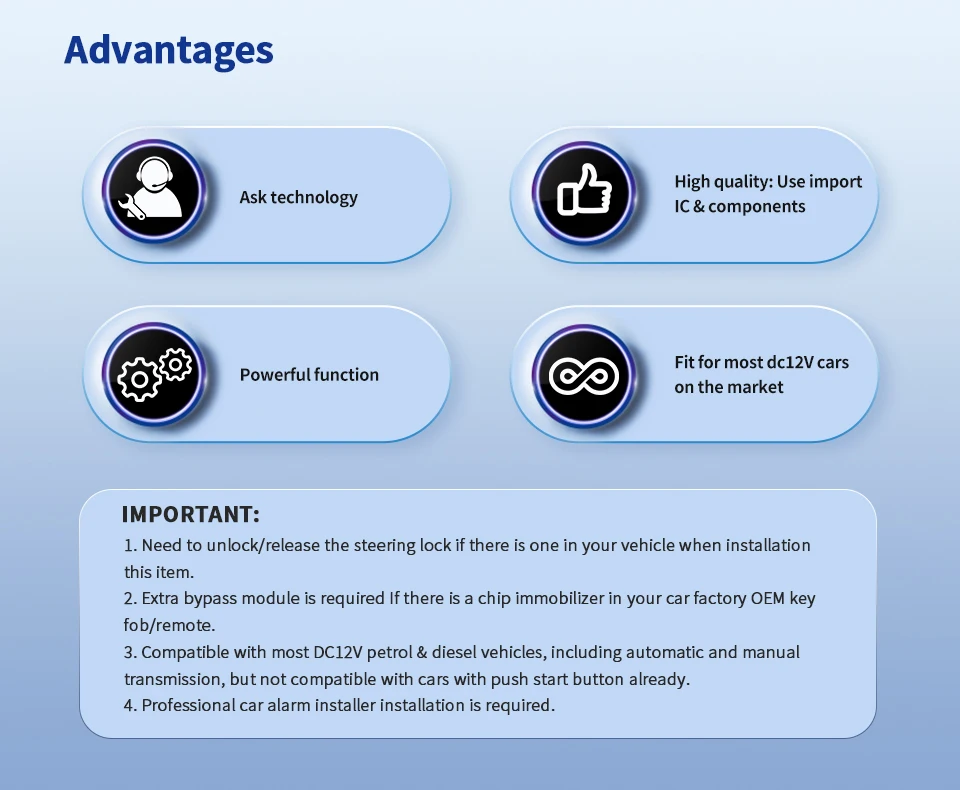 2. If there is a chip in your original car remote control (Key), you need to buy an extra bypass module or you can't use the remote start function.