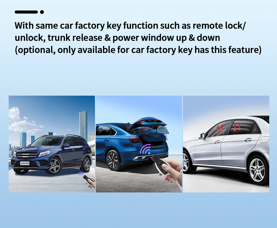 With same car factory key function such as remote lock/unlock, trunk release &power window up & down (optional, only available for car factory key has this feature)