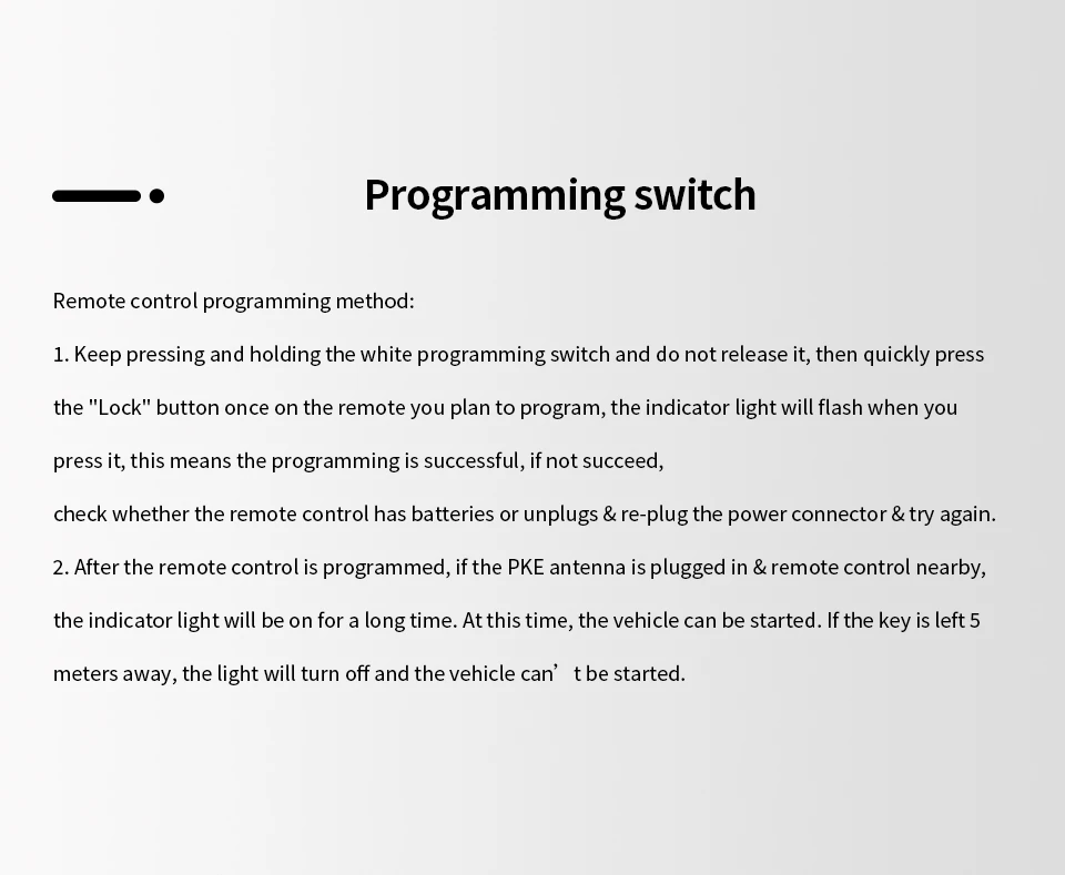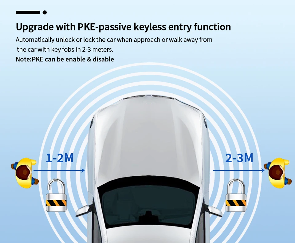 Upgrade with PKE-Passive keyless entry function (Automatically unlock or lock the car when approach or walk away from the car with key fobs in 2-3 meters. Note: PKE can be enable & disable)